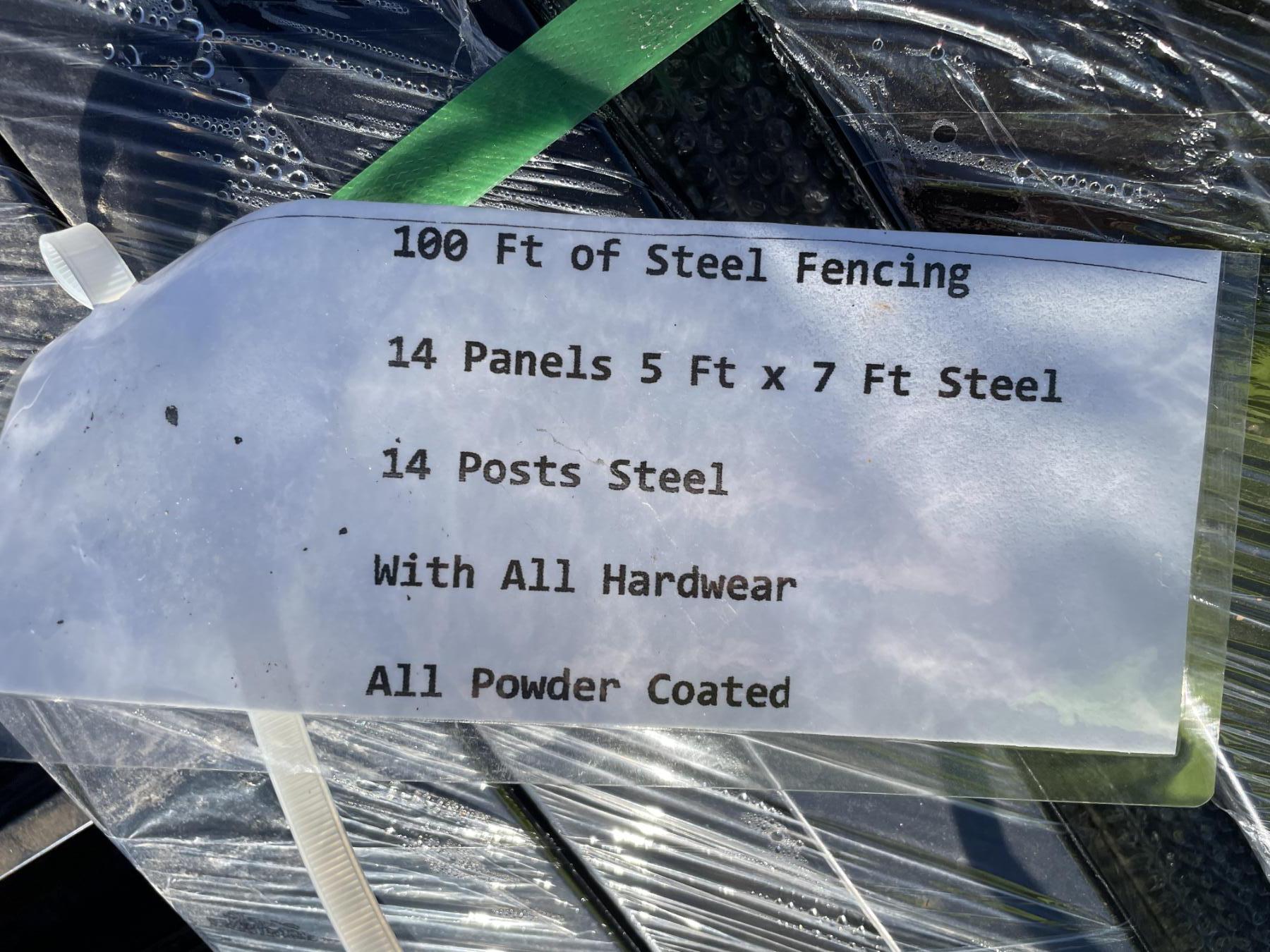 100' STEEL FENCING, (14) 5'X7' STEEL PANELS, (14) STEEL POSTS, W/ALL HARDWARE, POWDER COATED