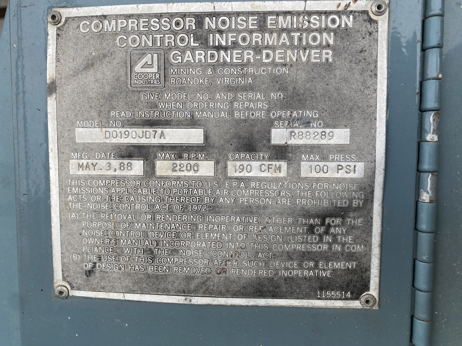 1988 GARDNER DENVER D0190 JD7A Air Compressor