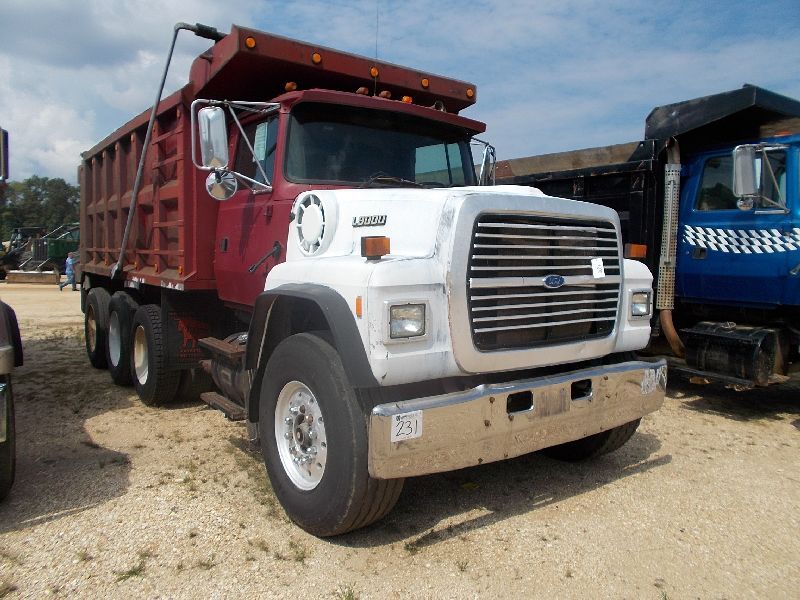 1995 FORD L9000 TRI-AXLE DUMP, S/N 1FDZU90X8SVA59442, CAT 350 HP ENG, 9 SPD TRANS, 46K REARS, 16K FRONT, ENGINE BRAKE, 16'-21YD OX BODY, ELECTRIC TRAP, AIR TAILGATE, MUD LOCKS, 11R24.5 REAR TIRES, 425/65R22.5 FRONT TIRES