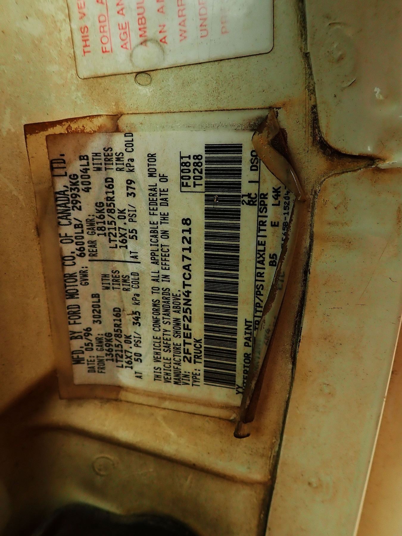 1996 FORD F250 PICKUP, VIN/SN:ZFTEF25N4TCA71218 - GAS ENGINE, A/T, ODOMETER READING 271,037 MILES(CO