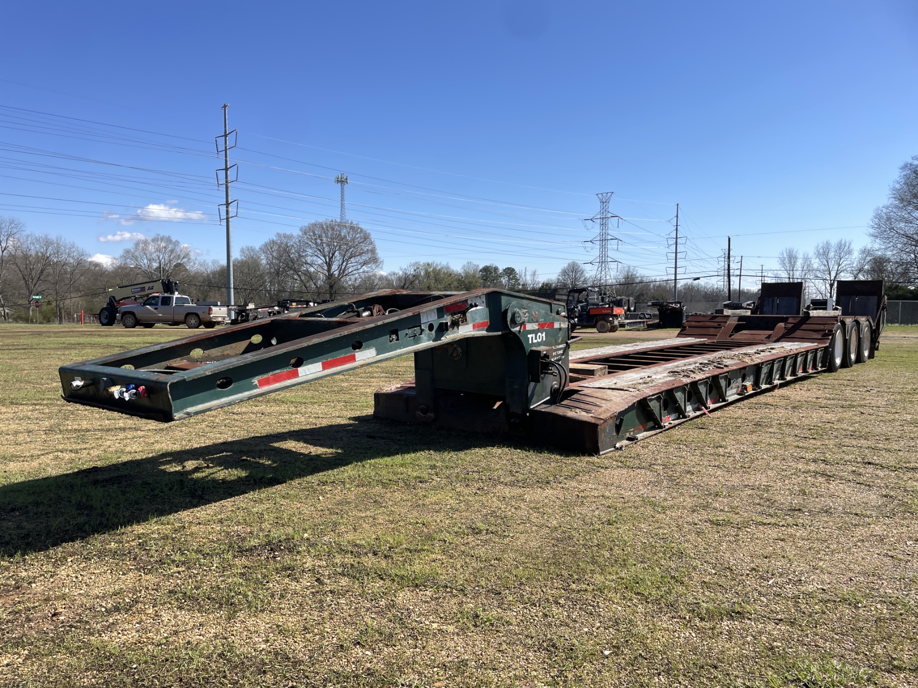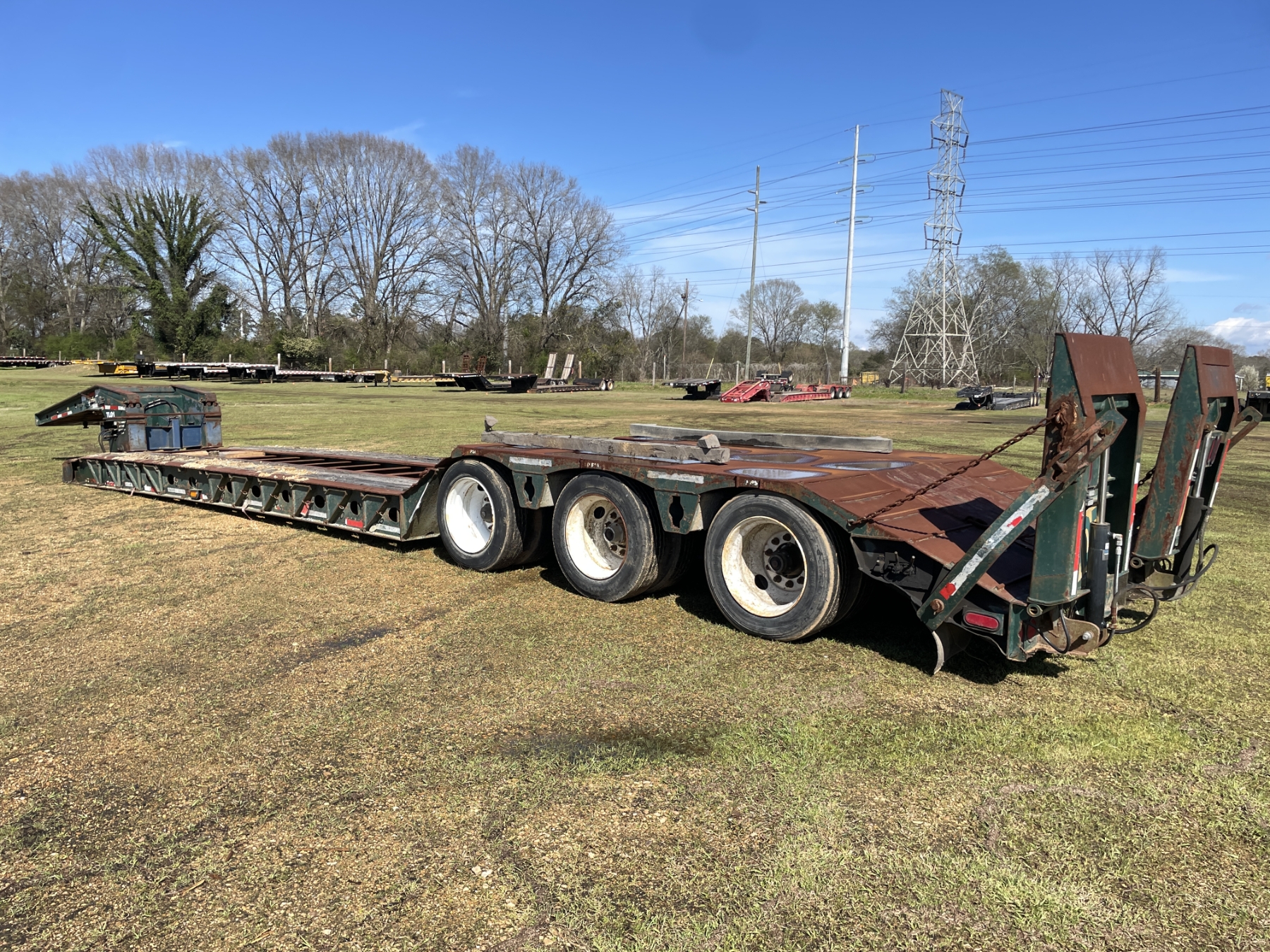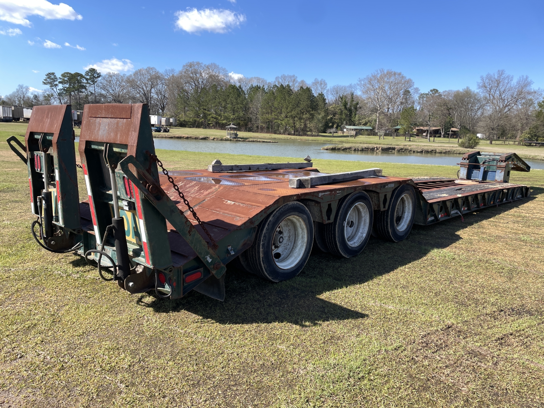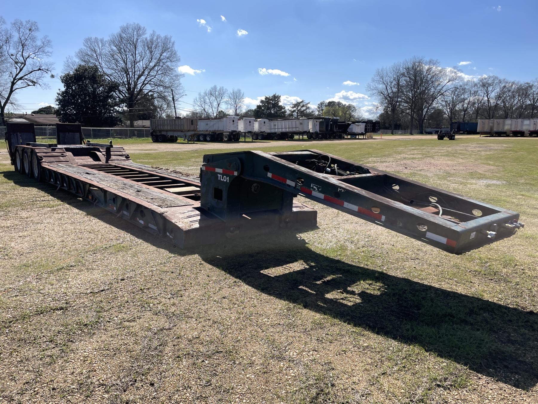 Tri Axle, RGN, NGB, 23' well, 102" width, covered wheel wells, dovetail, hyd ramps, air ride, 255/70R22.5 tires