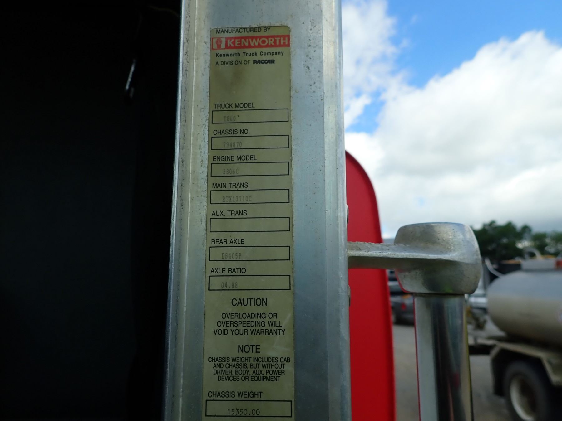 1999 KENWORTH T800 WATER TRUCK, VIN/SN:1NKDLA9X7XJ794870 - CAT 3306C ENGINE, 10 SPEED TRANS, 40K REARS, 12,860LB FRONT, 4,000 GAL TANK, REAR DISCHARGE, 11R24.5 REAR TIRES, 315/80R22.5 FRONT TIRES, ODOMETER READING 475,184 MILES