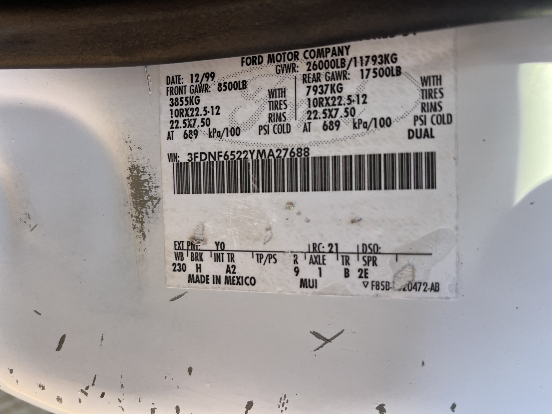 Vehicle ID Number: 3FDNF6522YMA27688