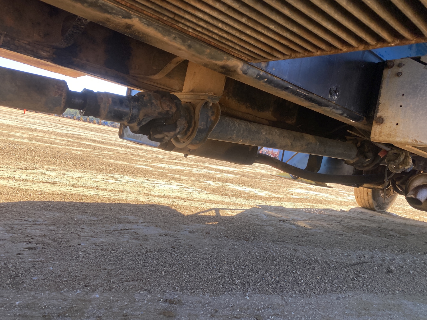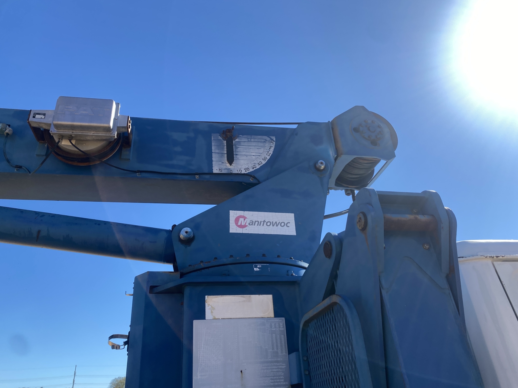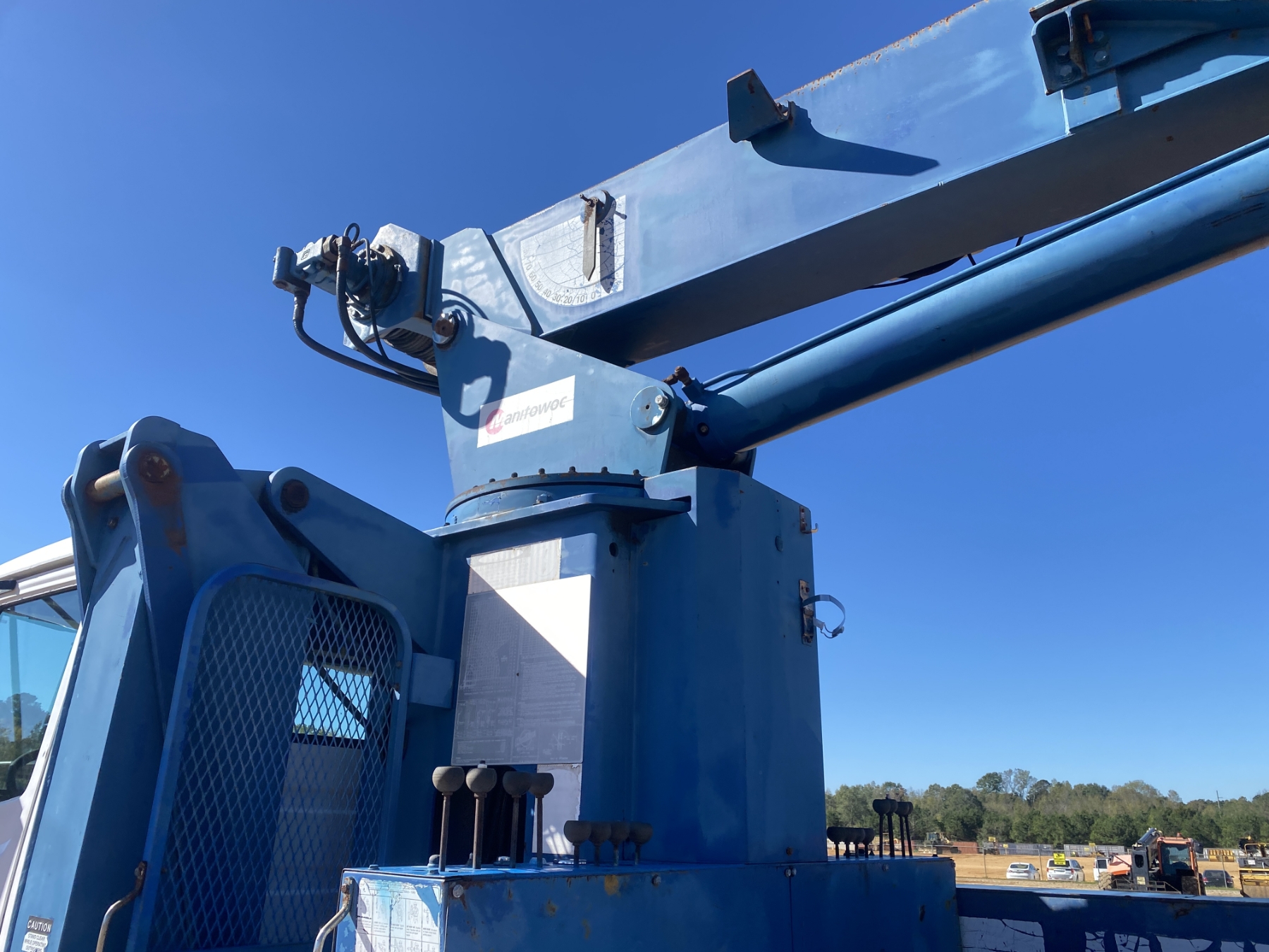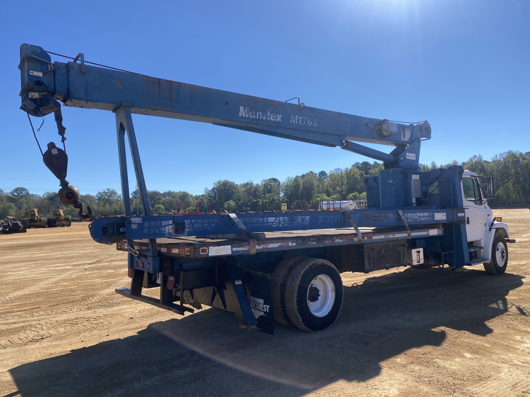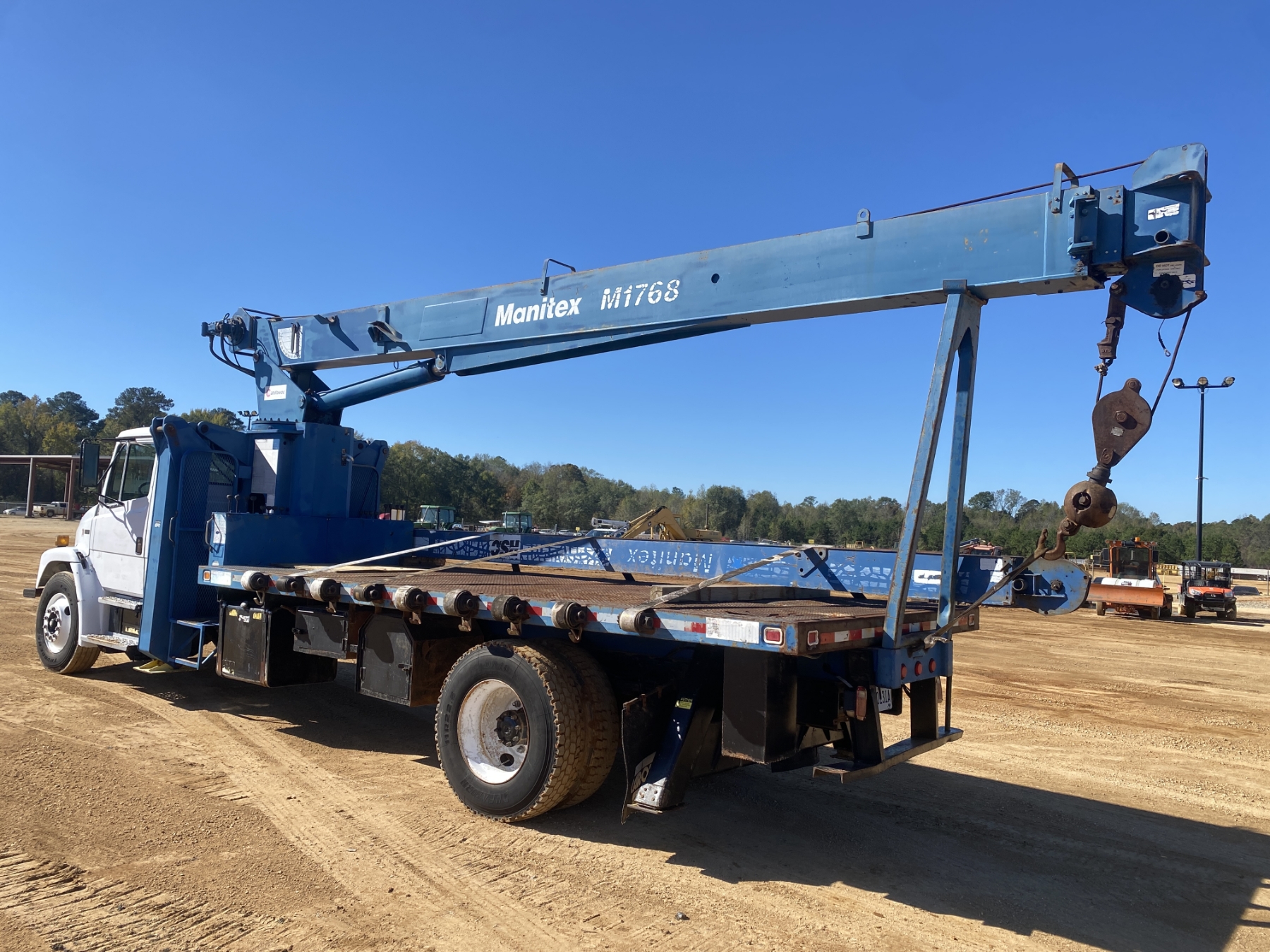 S/A, Cummins ISB 225 engine, 6 speed trans, Manitex M1768 front mtd. crane, 68' boom, 23' jib, 7 Ton single-sheave block w/ headache ball, 18' flatbed, 11R22.5 tires