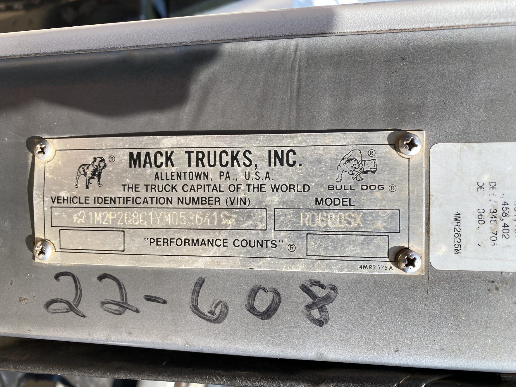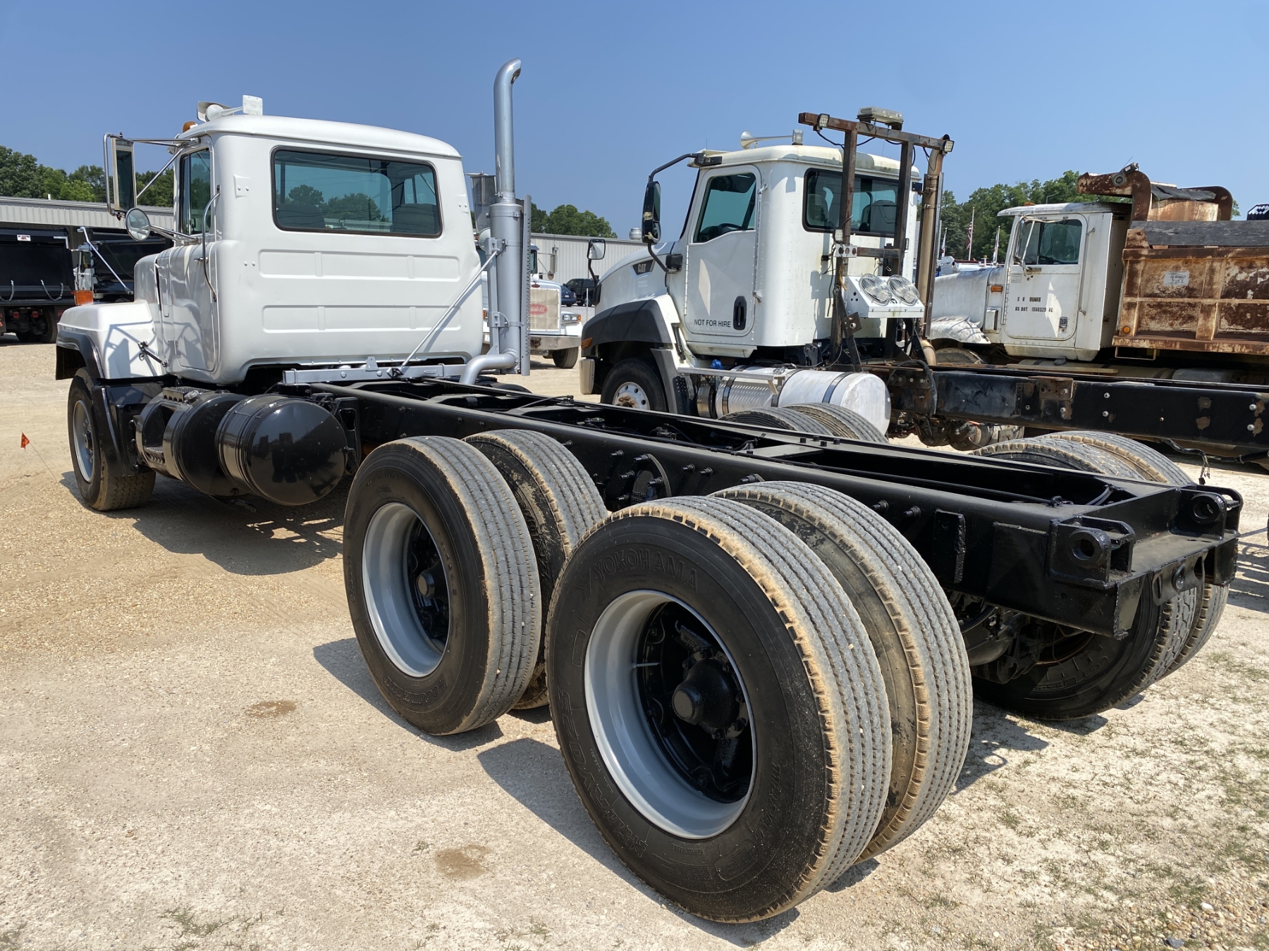 T/A, Mack E7-350 engine, 8LL trans, 50,640 lb. rears, 16,540 lb. front, 11R24.5 rear tires, 385/65R22.5 front tires