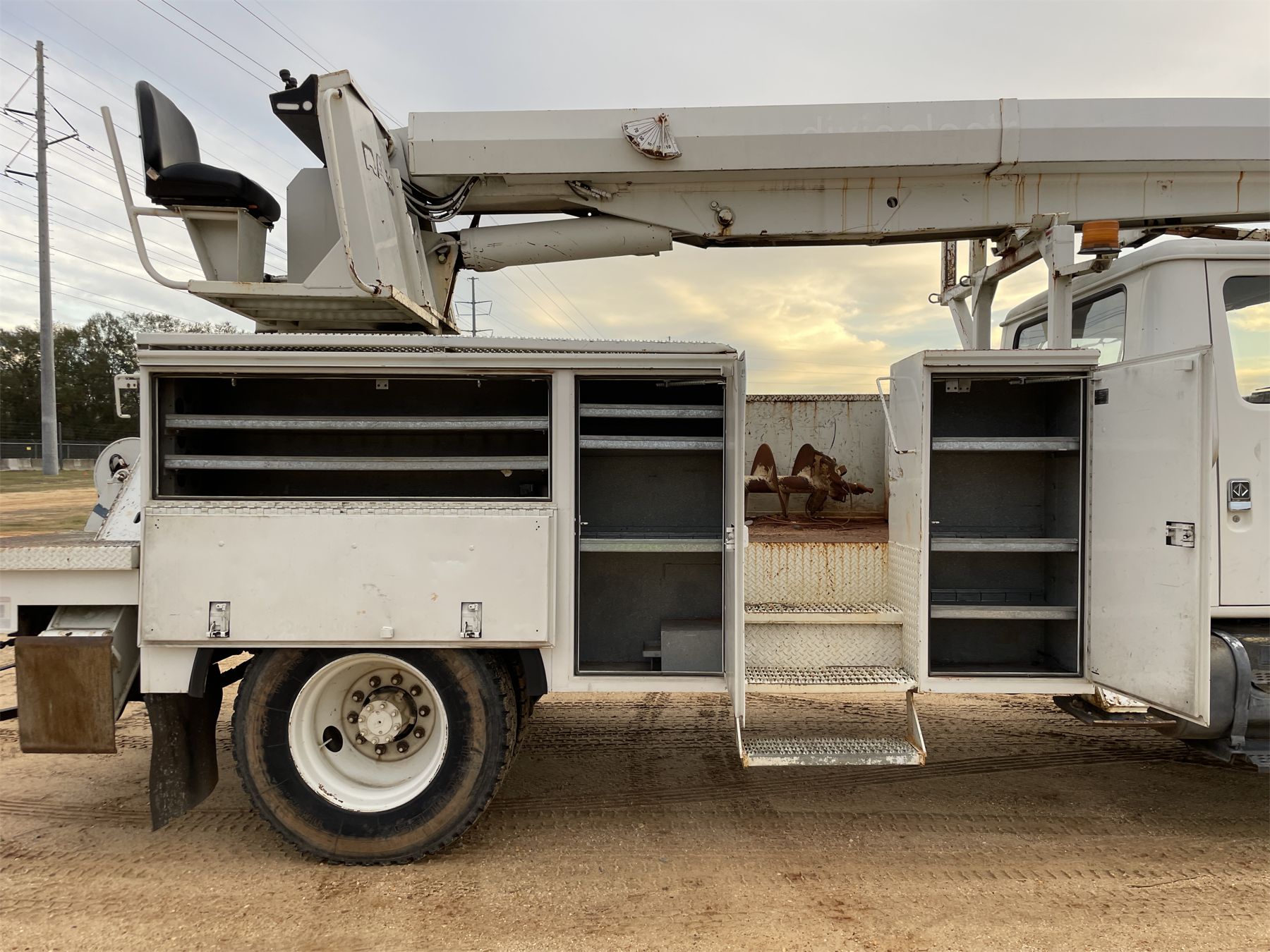 S/A, Int DT466 engine, A/T, Altec service body, Altec D947BR digger system, material handler, bucket, outriggers