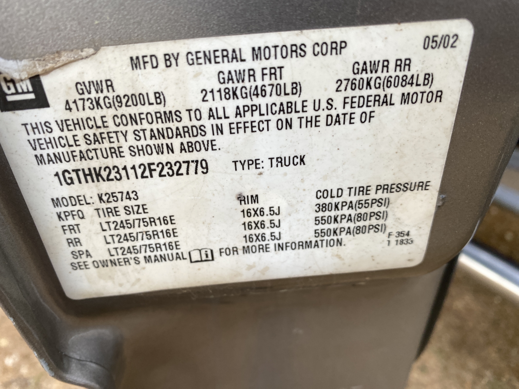Vehicle ID Number: 1GTHK23112F232779