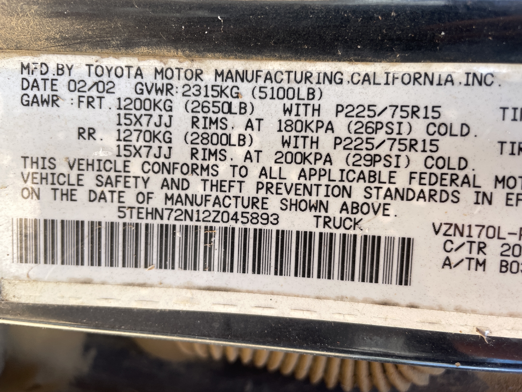 Vehicle ID Number: 5TEHN72N12Z045893