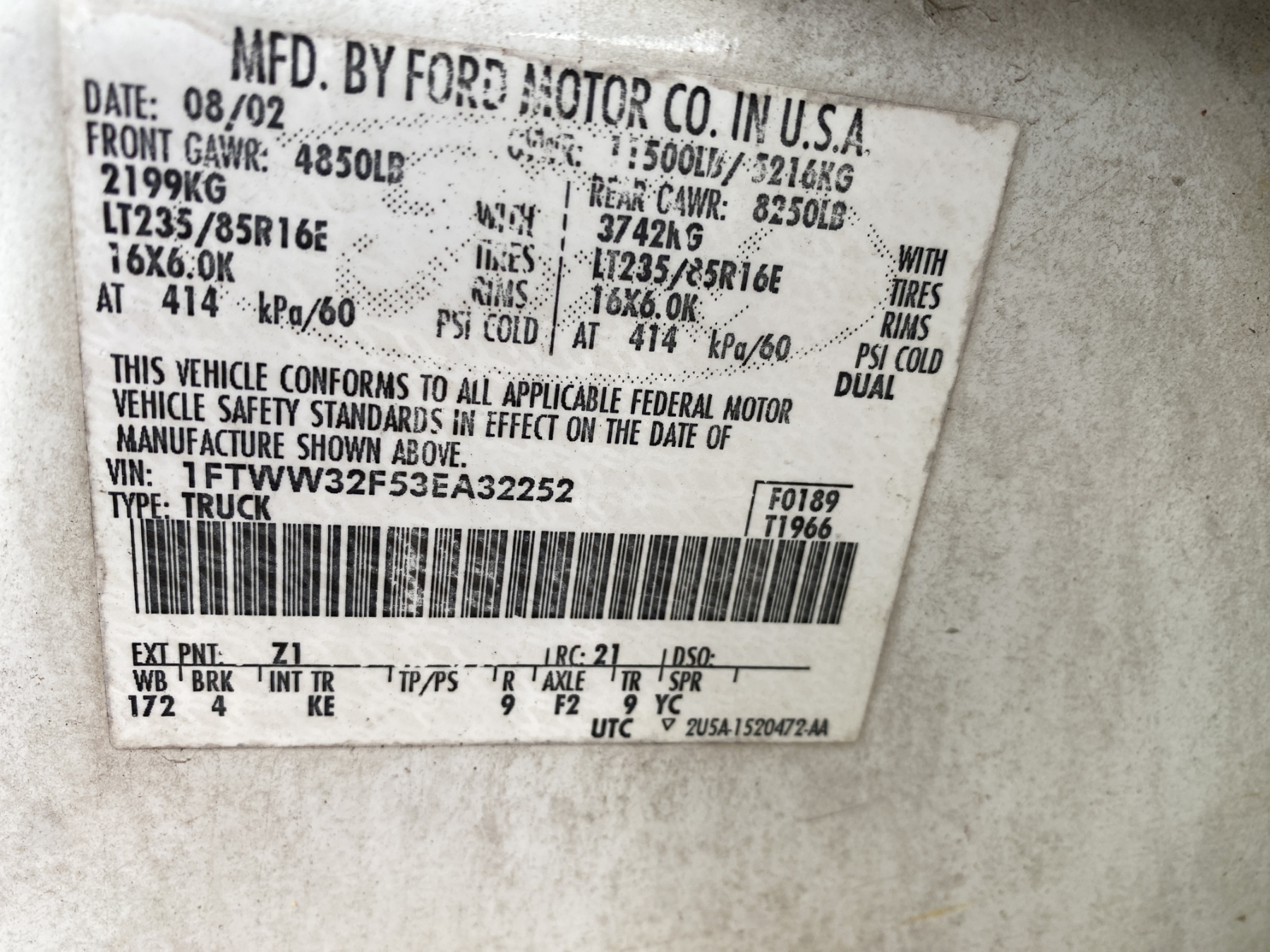 Vehicle ID Number: 1FTWW32F53EA32252
