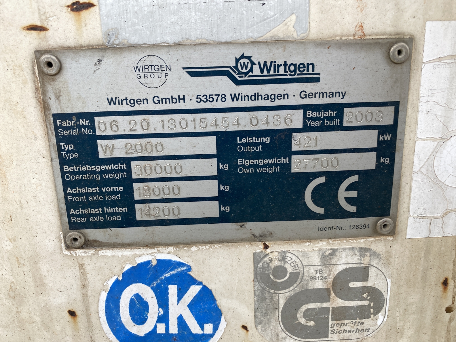 2003 WIRTGEN W2000 MILLING MACHINE Cold Planer
