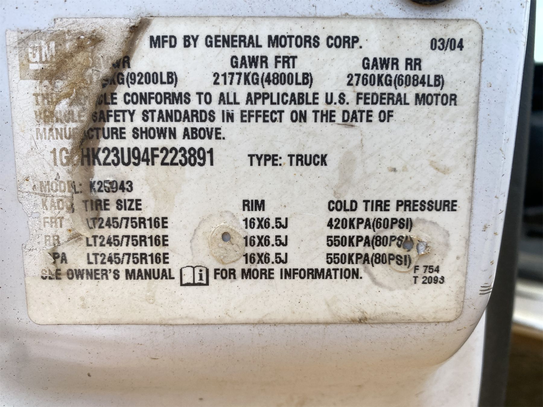 Vehicle ID Number: 1GCHK23U94F223891
