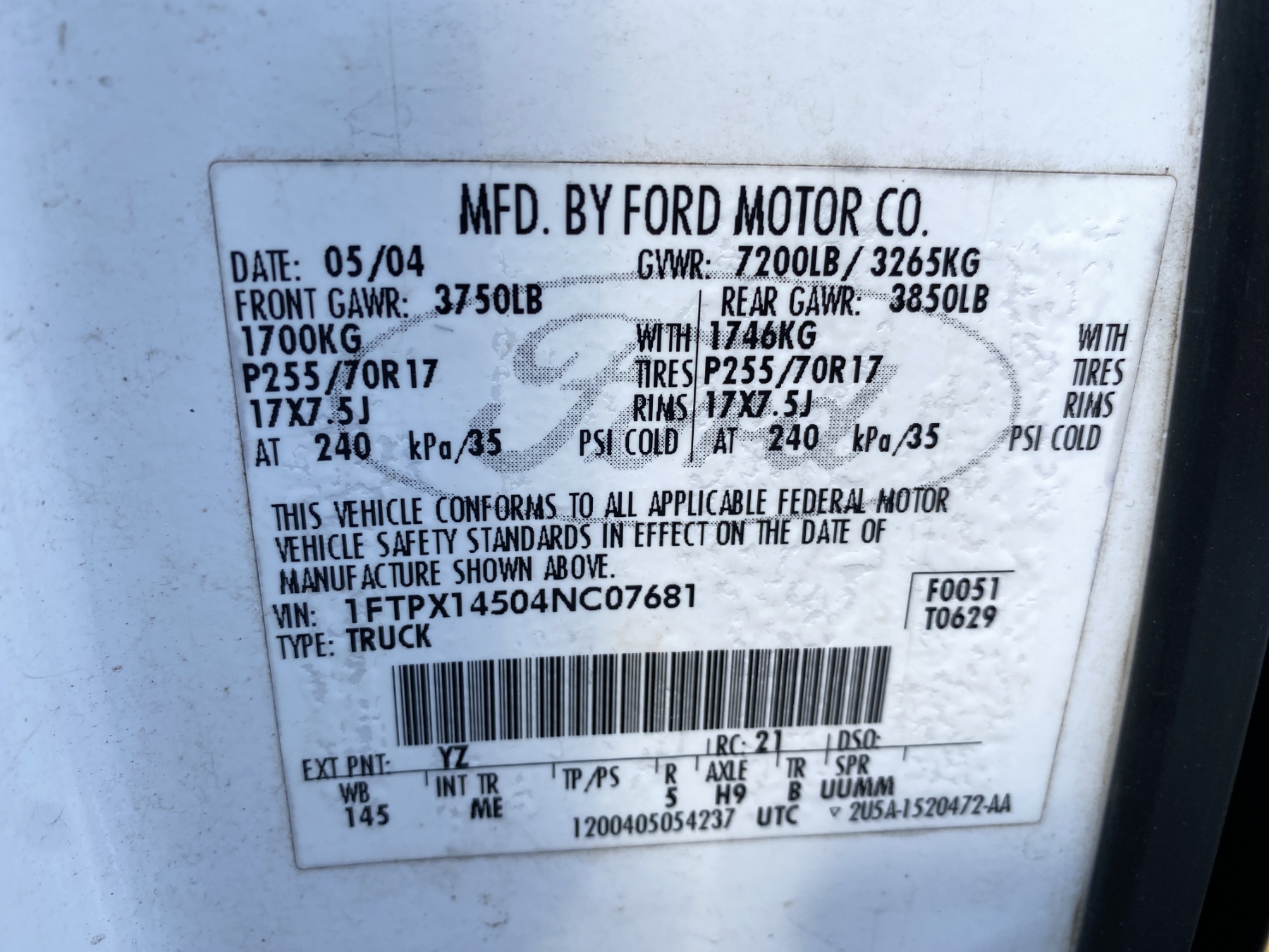 Vehicle ID Number: 1FTPX14504NC07681