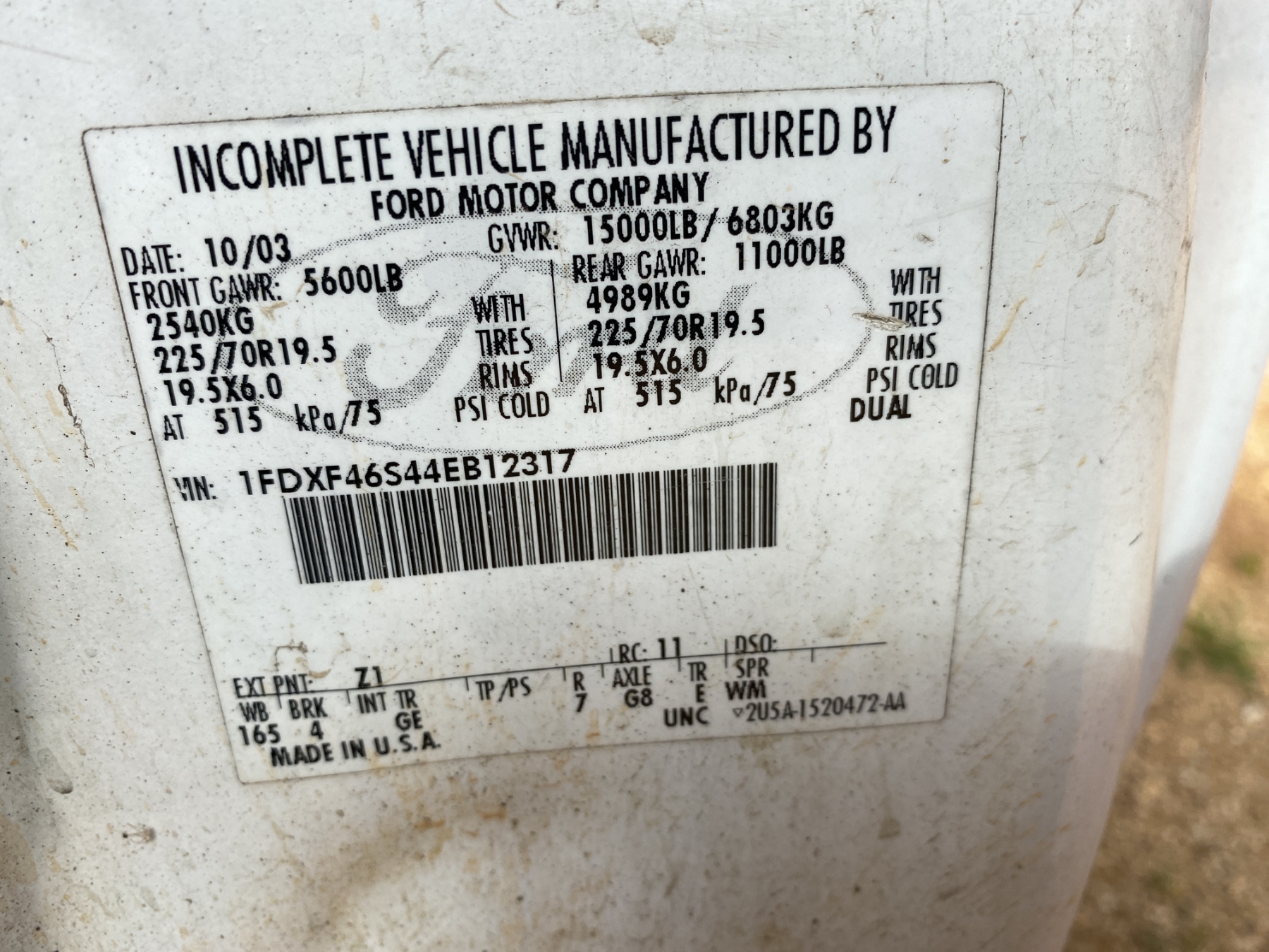 Vehicle ID Number: 1FDXF46S44EB12317
