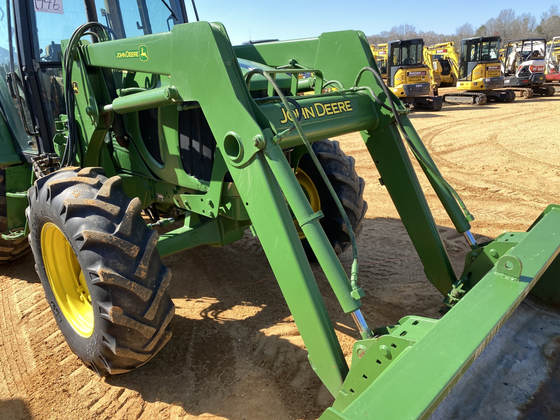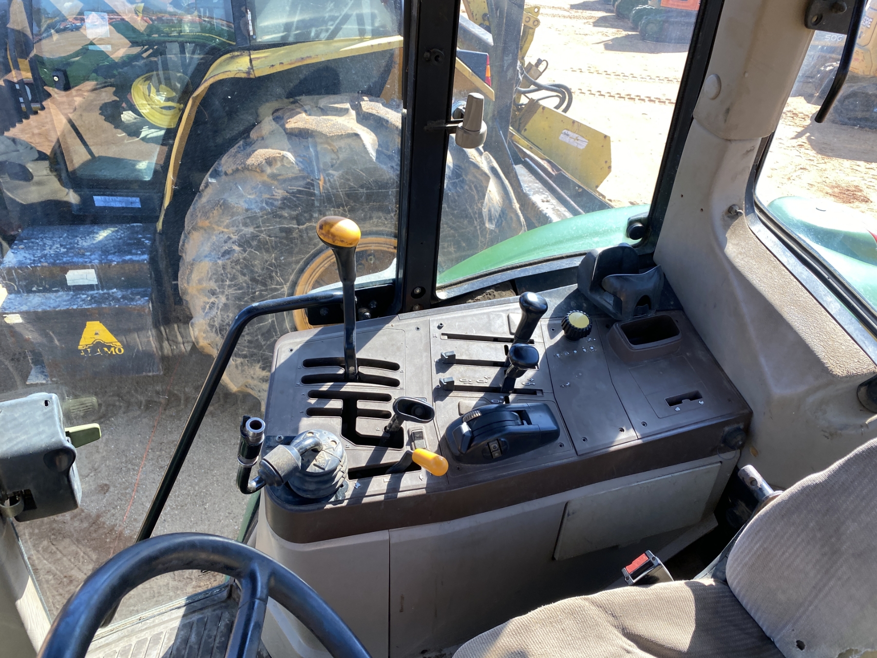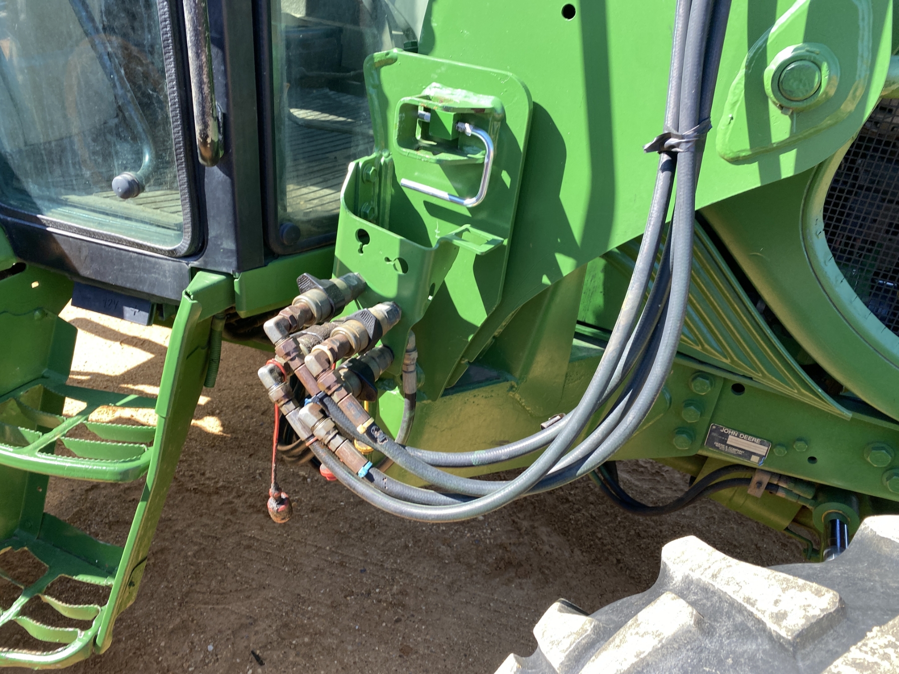 MFWD, (3) remotes, John Deere front loader attach, bucket, cab, A/C, 18.4-38 rear tires, 13.6-24 front tires