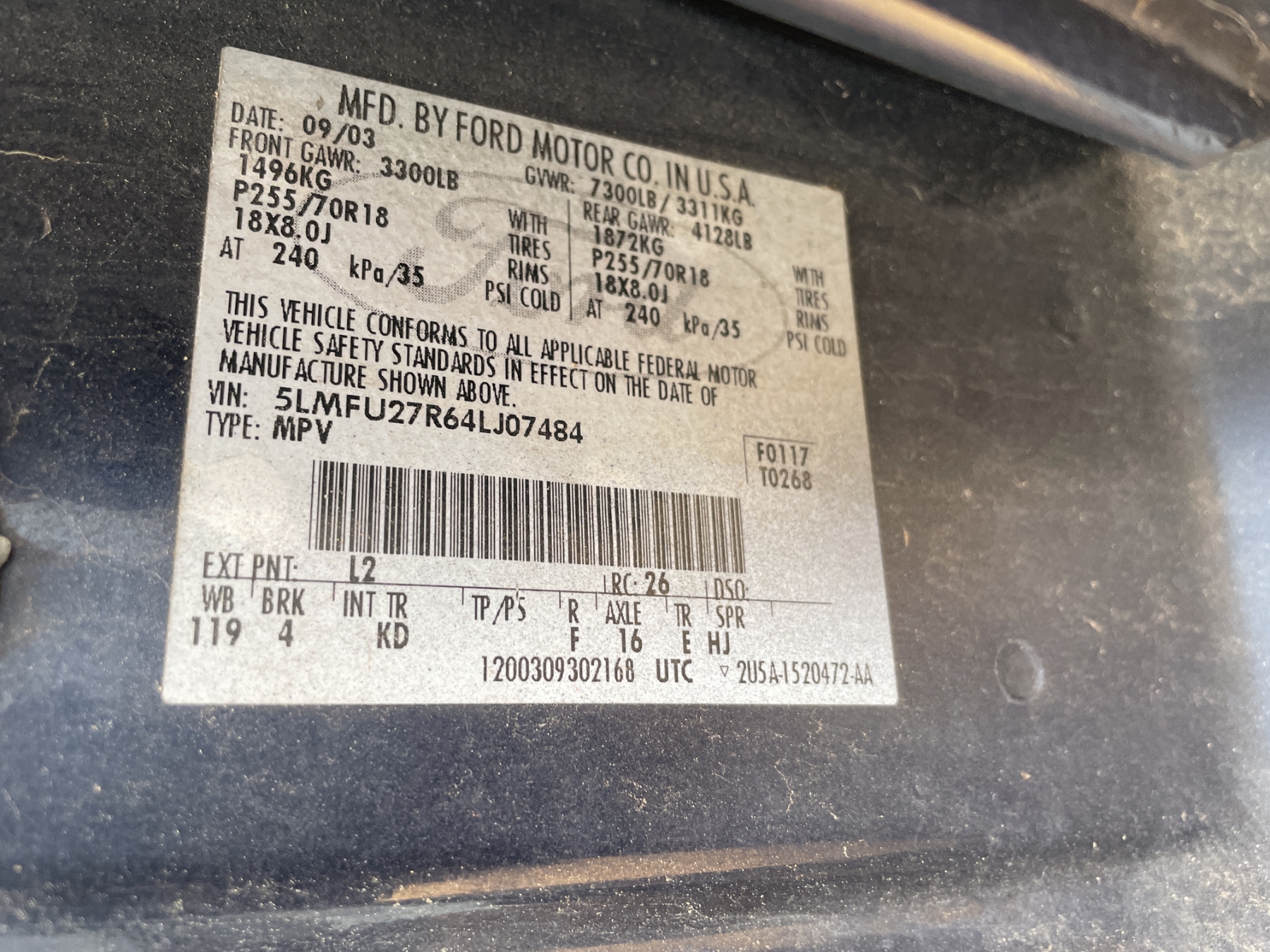 Vehicle ID Number: 5LMFU27R64LJ07484