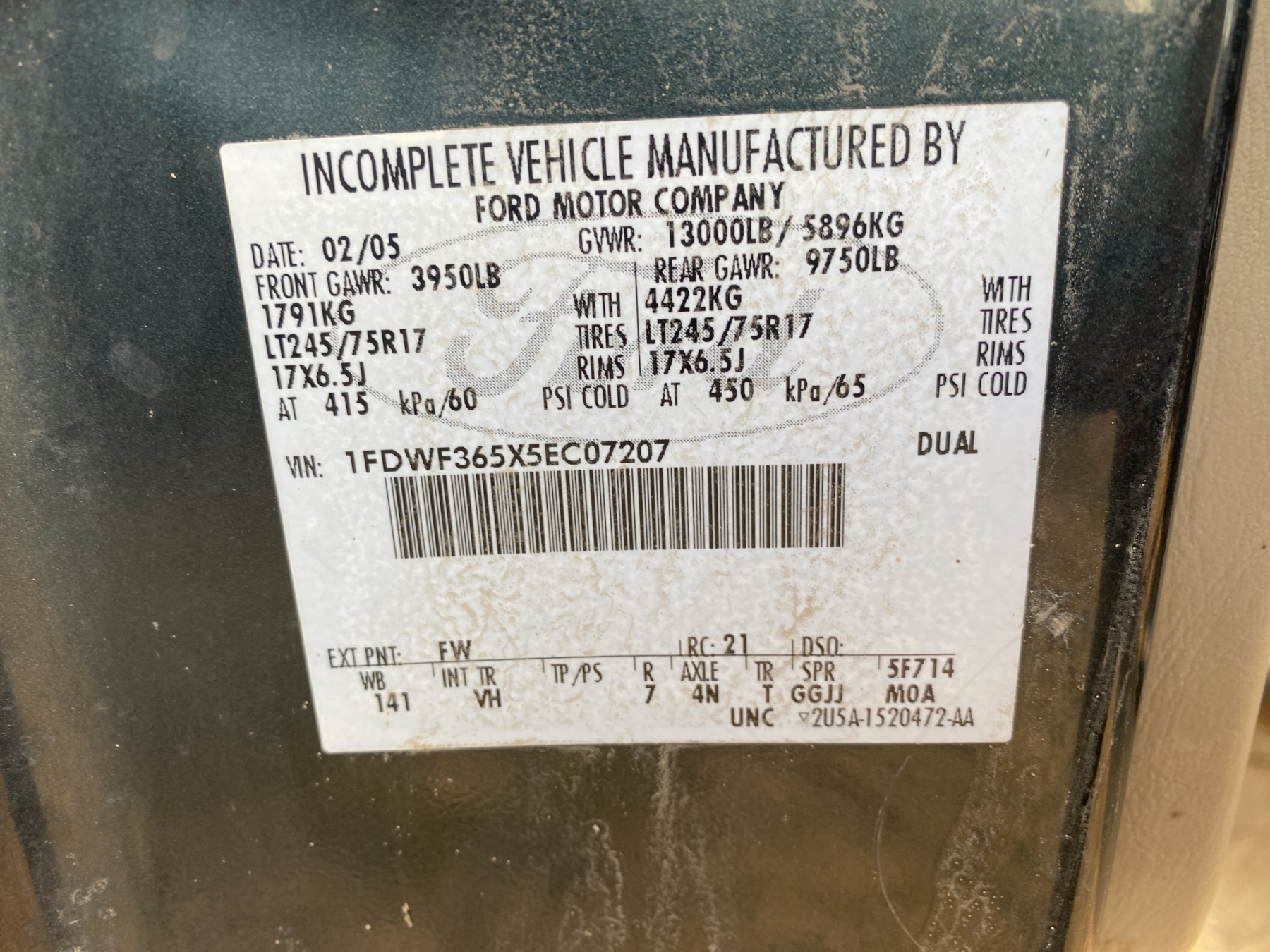 Vehicle ID Number: 1FDWF365X5EC07207