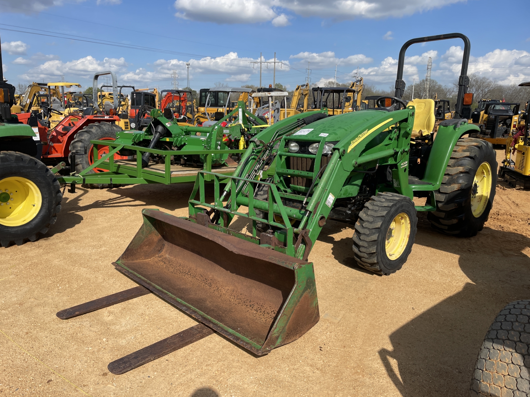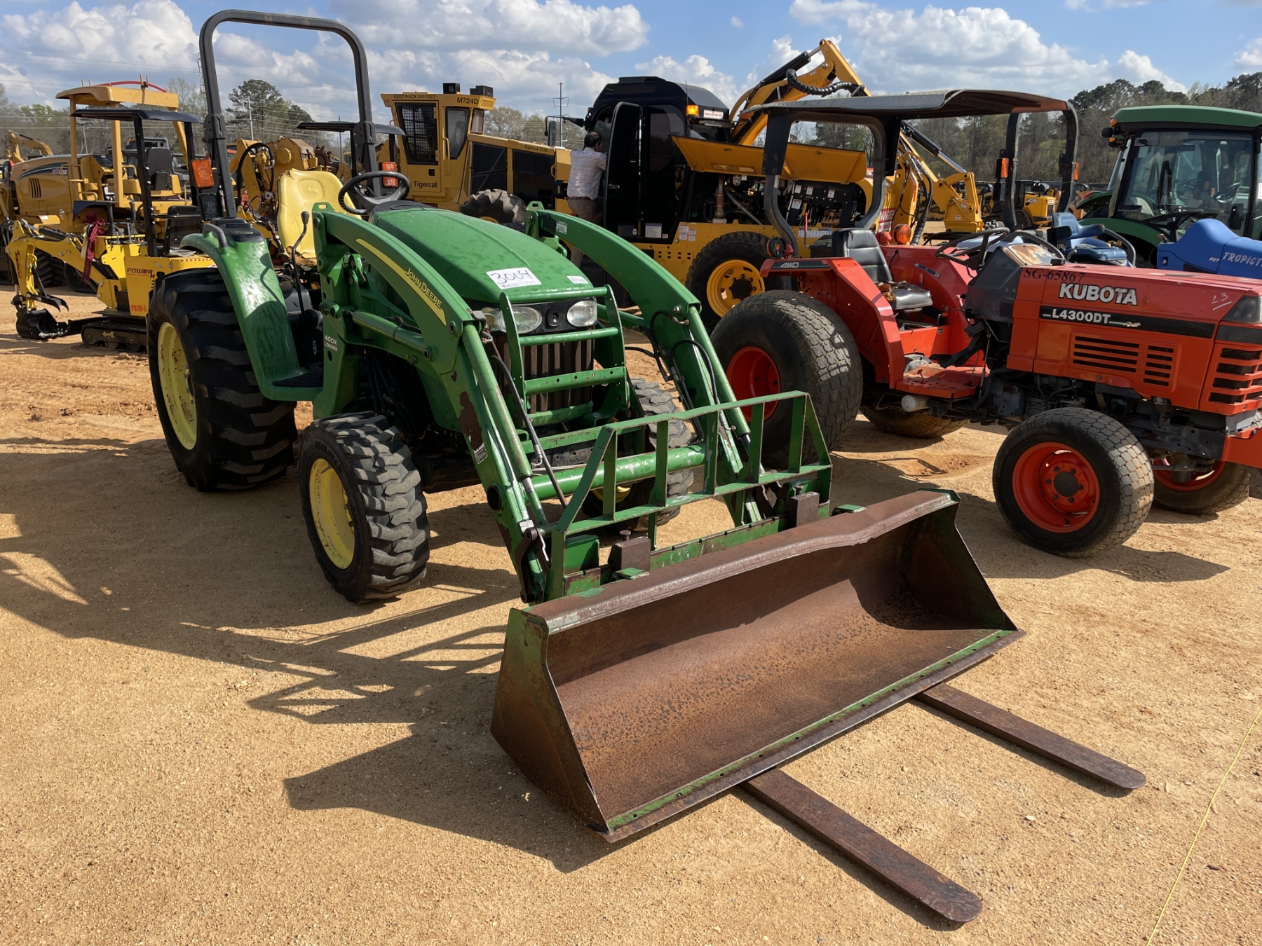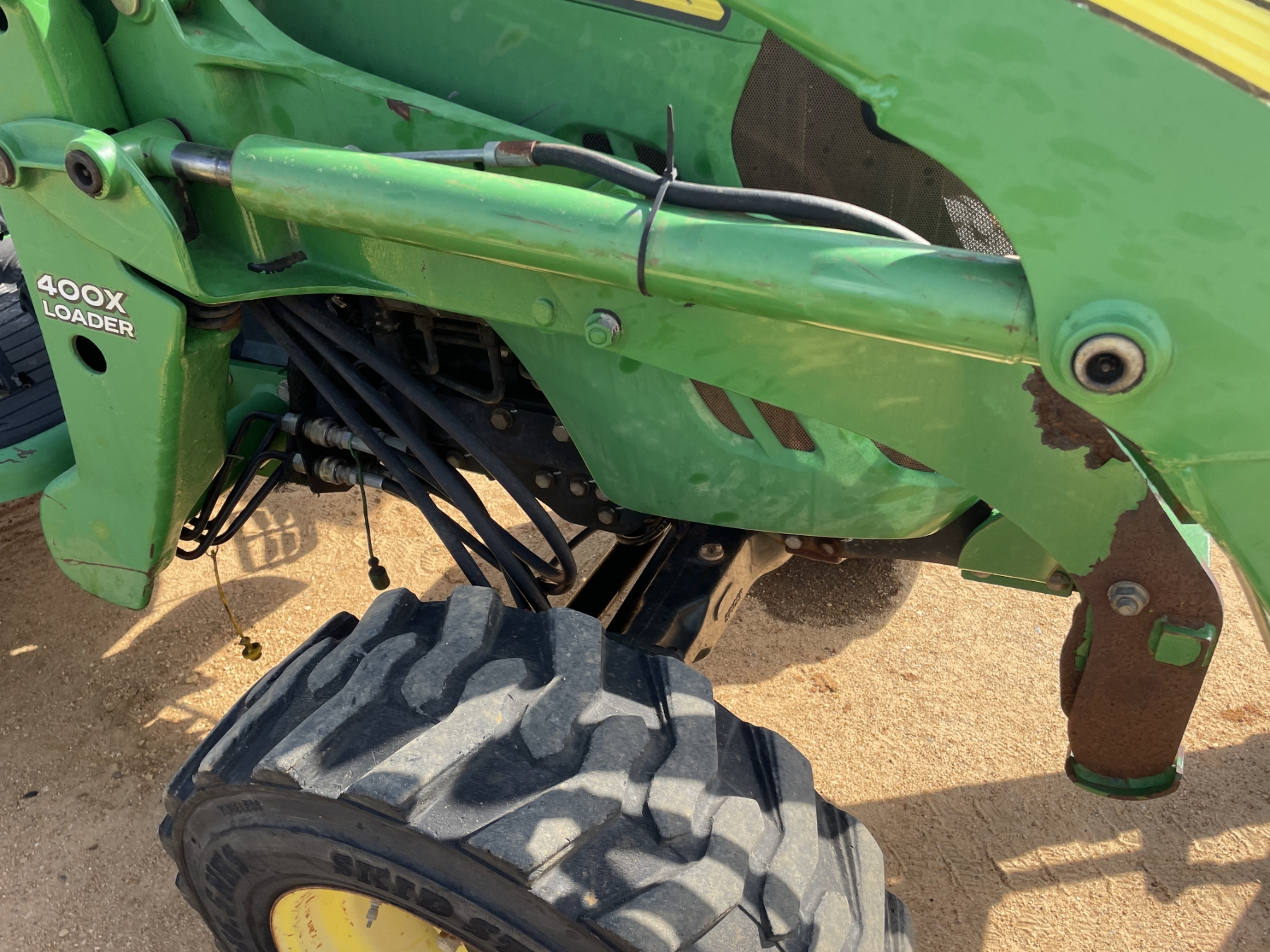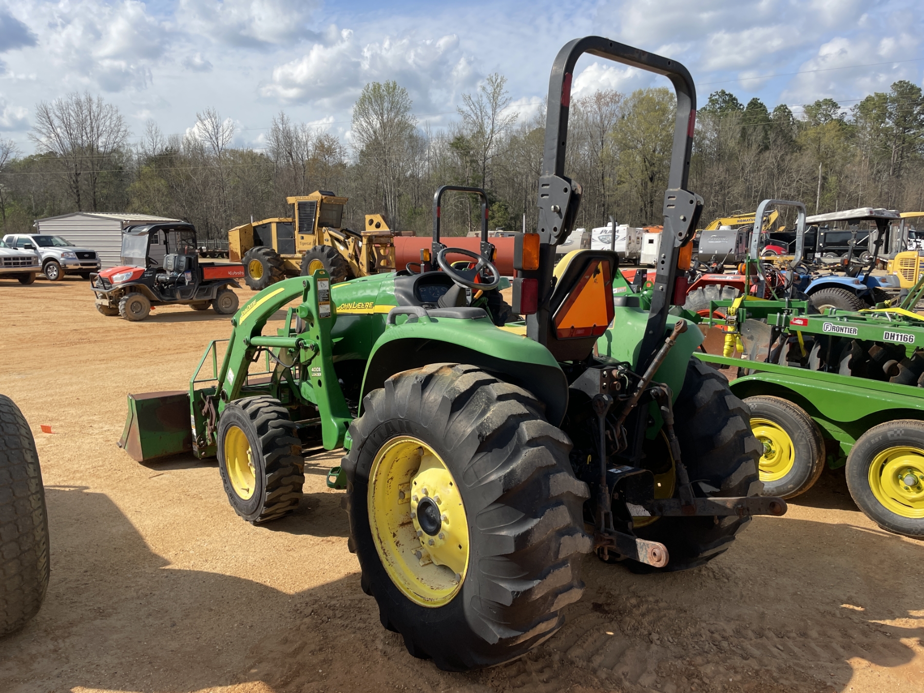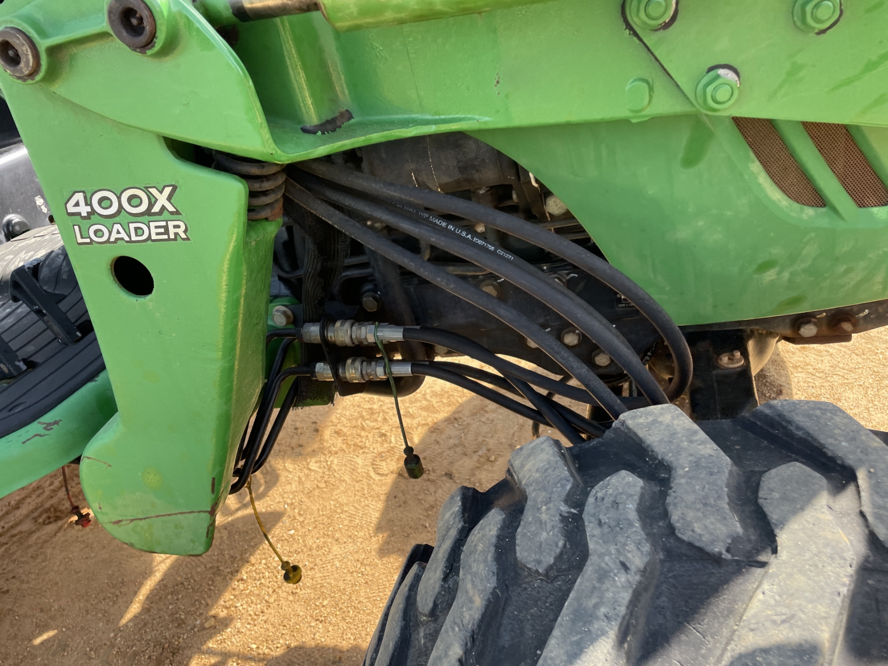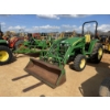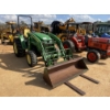 MFWD, (1) remote, John Deere 400X front loader attach, forks, bucket, roll bar, 17.5-24 rear tires, 10-16.5 front tires