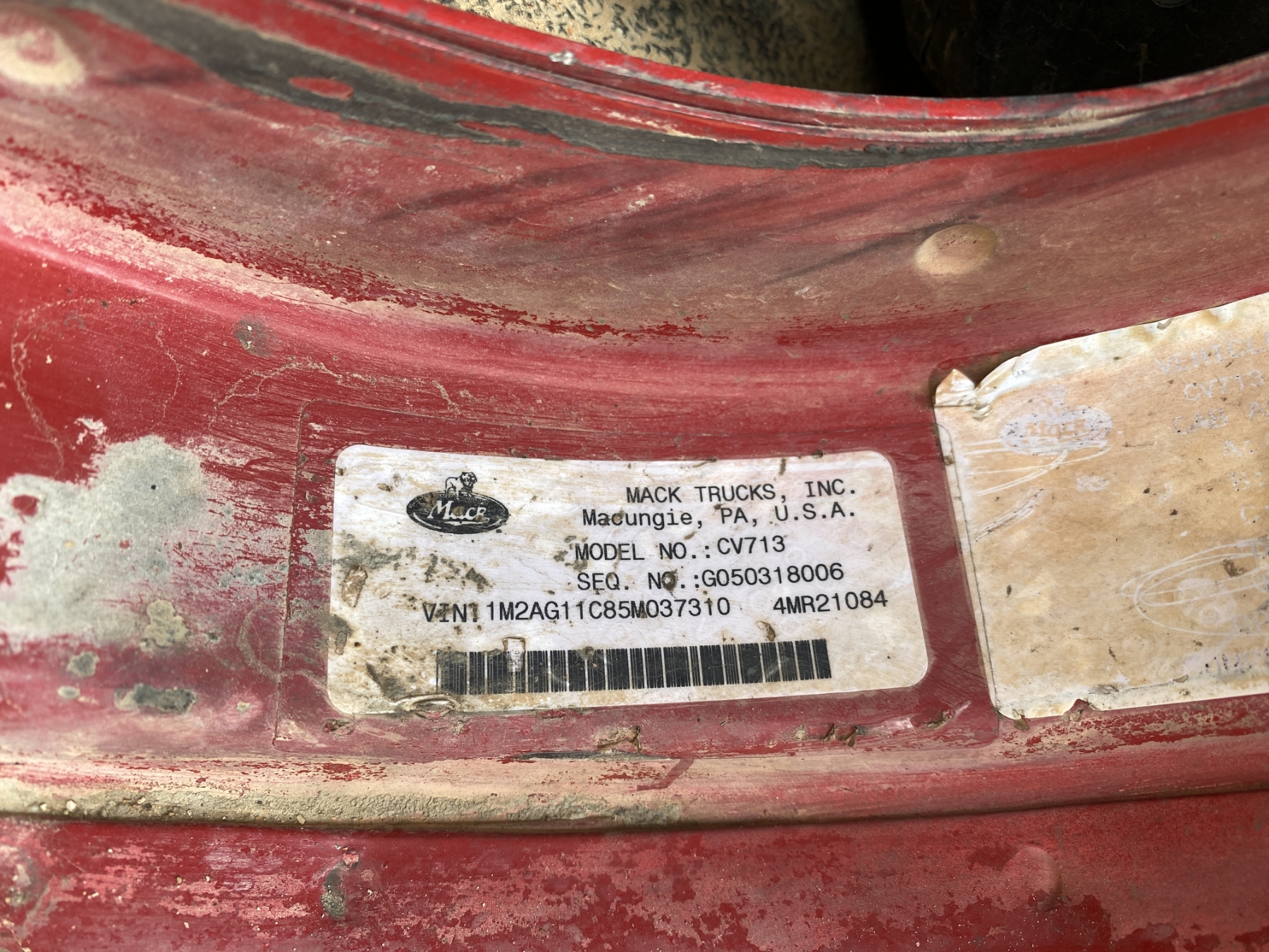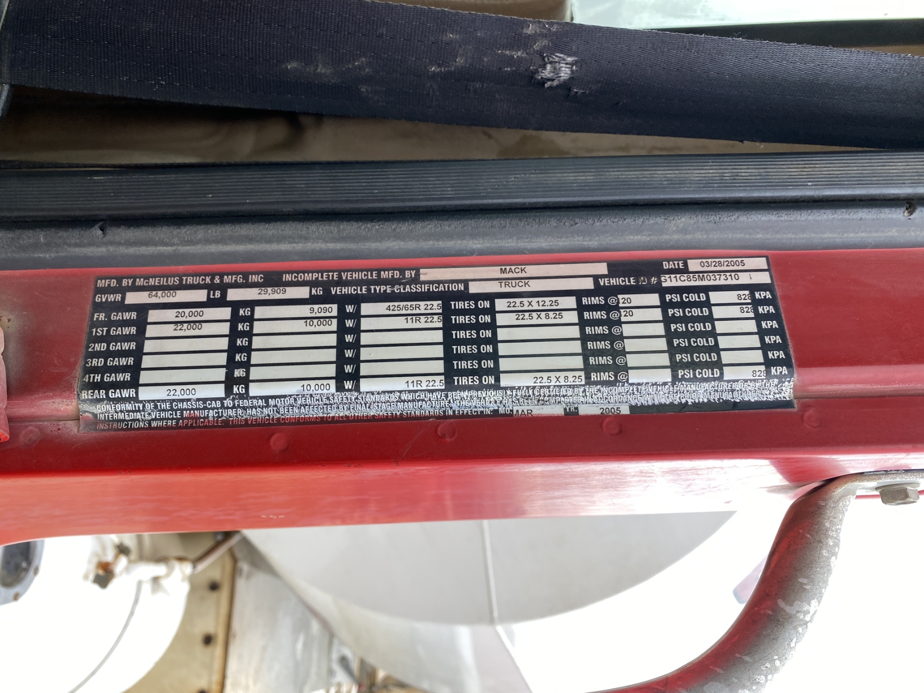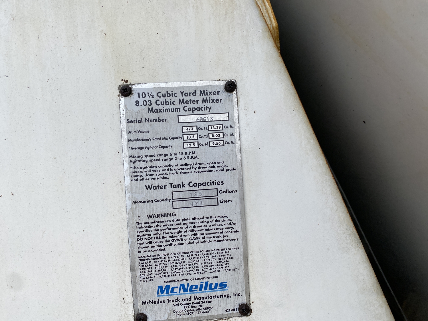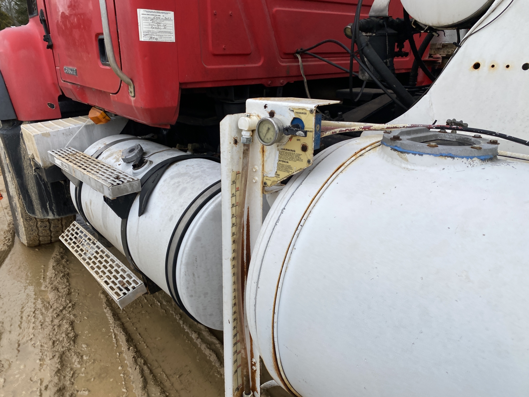 T/A, Mack AMI engine, Mack 10 speed trans, 44K rears, 20K front, 10.5 Yd McNeilus body, 11R24.5 rear tires, 385/65R22.5 front tires