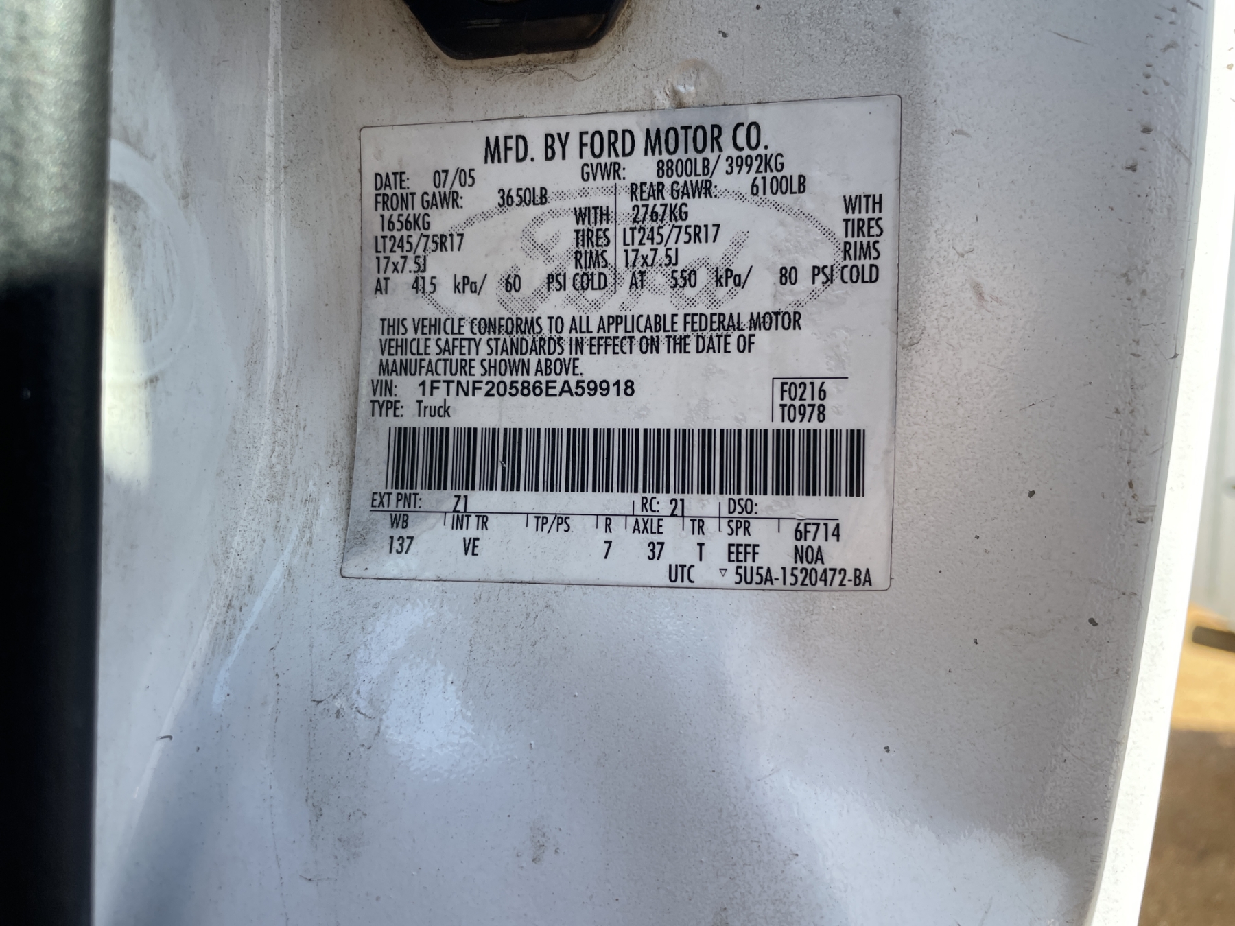 Vehicle ID Number: 1FTNF20586EA59918