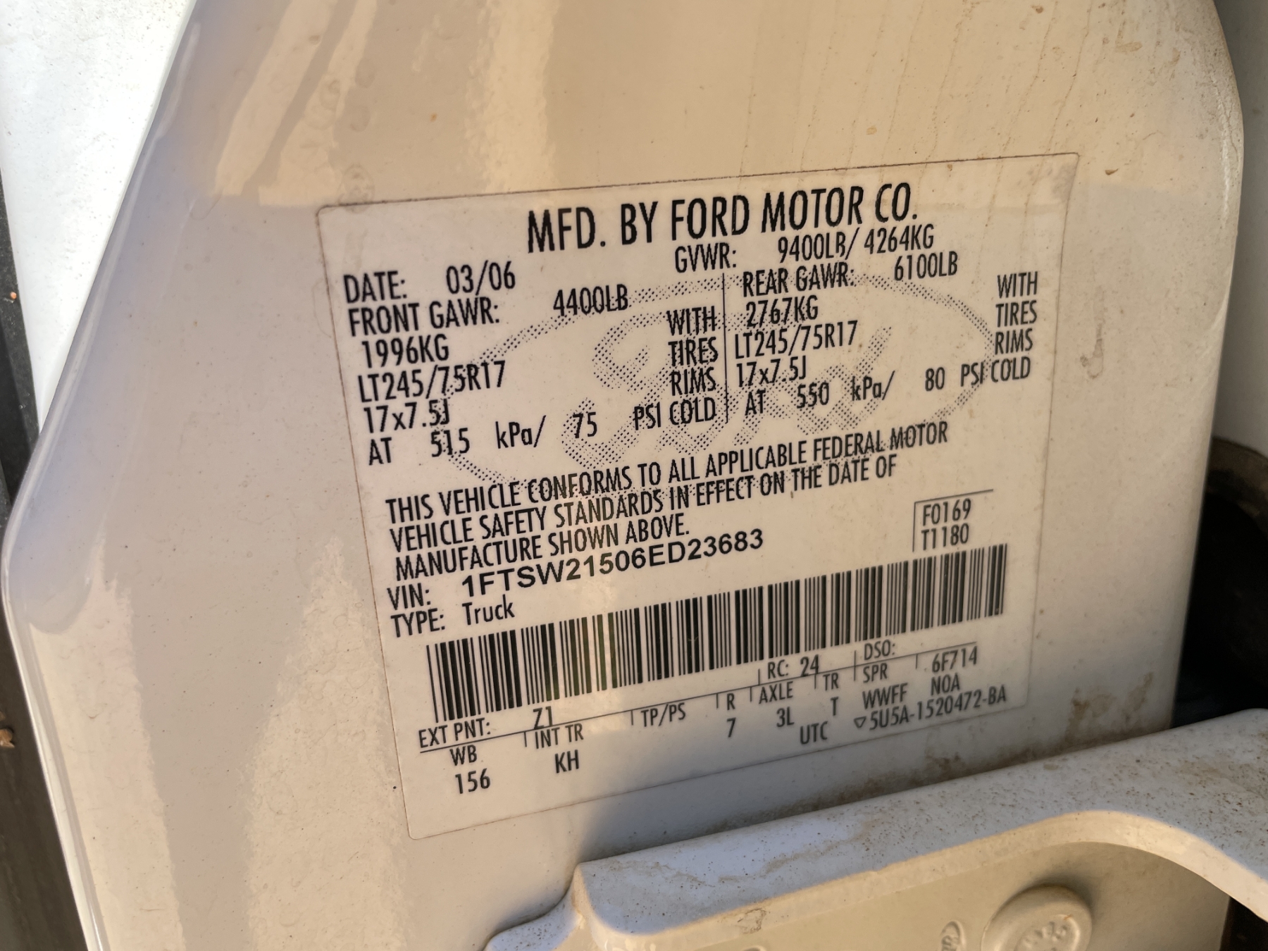 Vehicle ID Number: 1FTSW21506ED23783