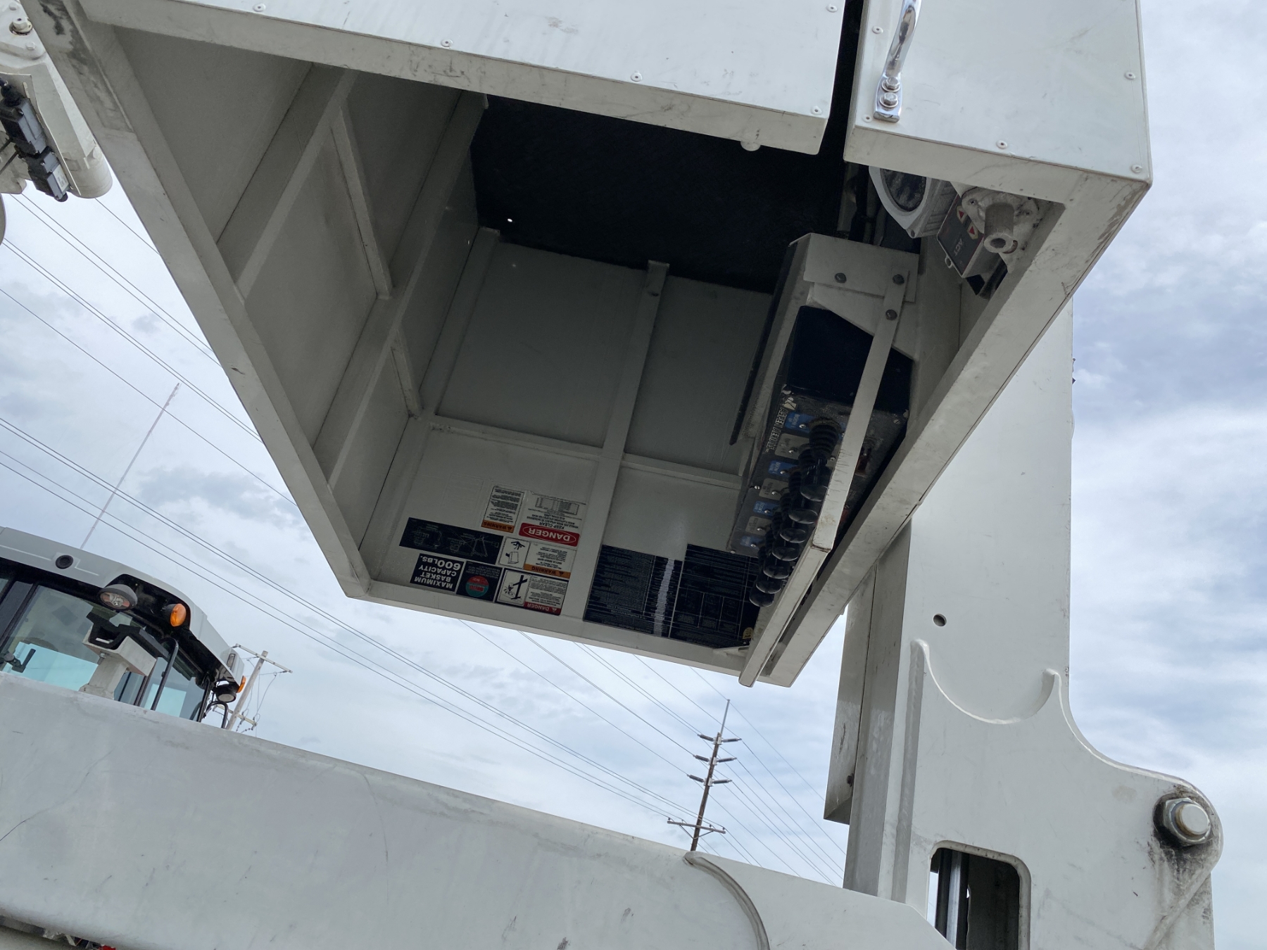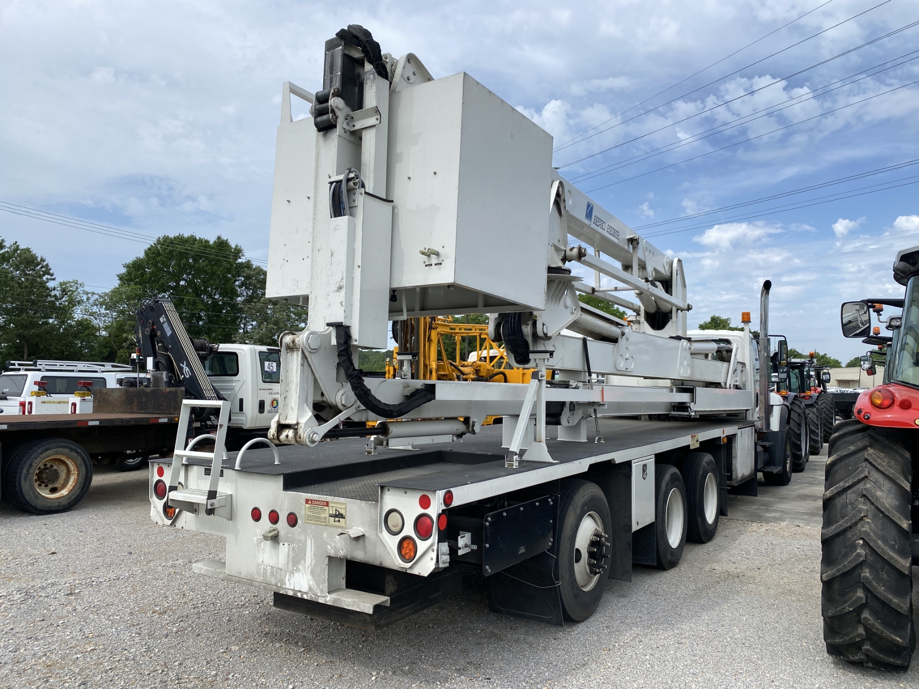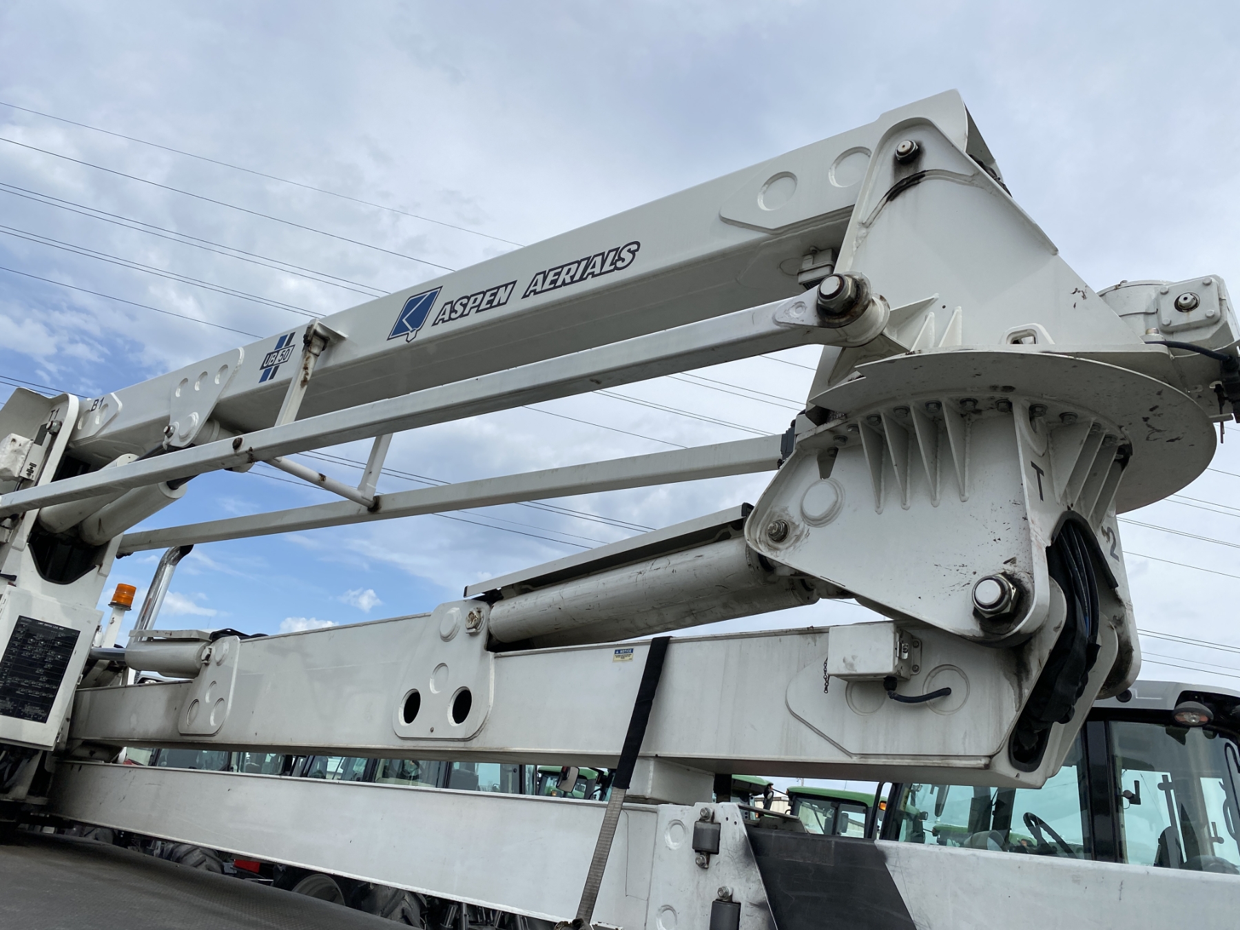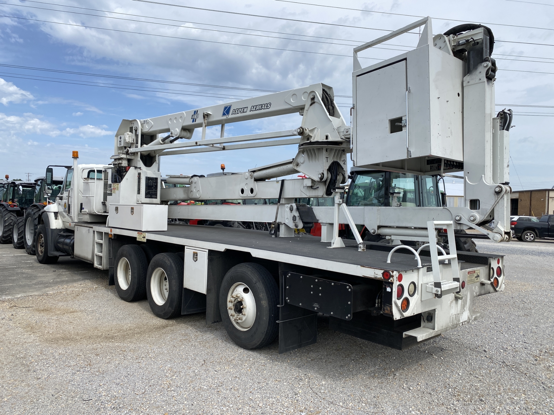 Tri Axle, International engine, Allison A/T, Aspen Aerial UB50 bucket, 600 lb. capacity, flatbed body, 11R22.5 rear tires, 425/65R22.5 front tires, (Certification is Current)