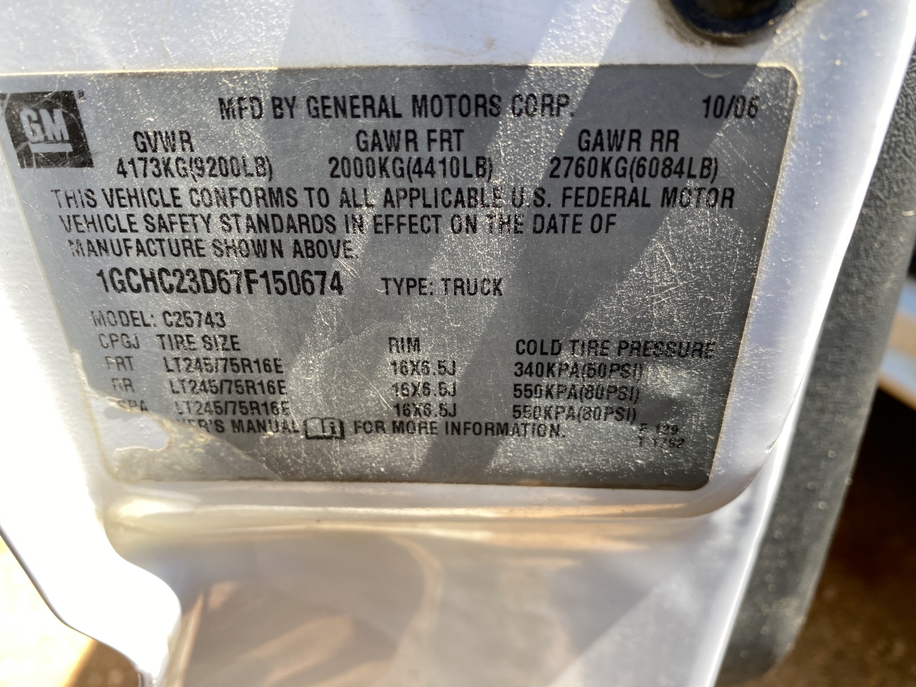Vehicle ID Number: 1GCHC23D67F150674