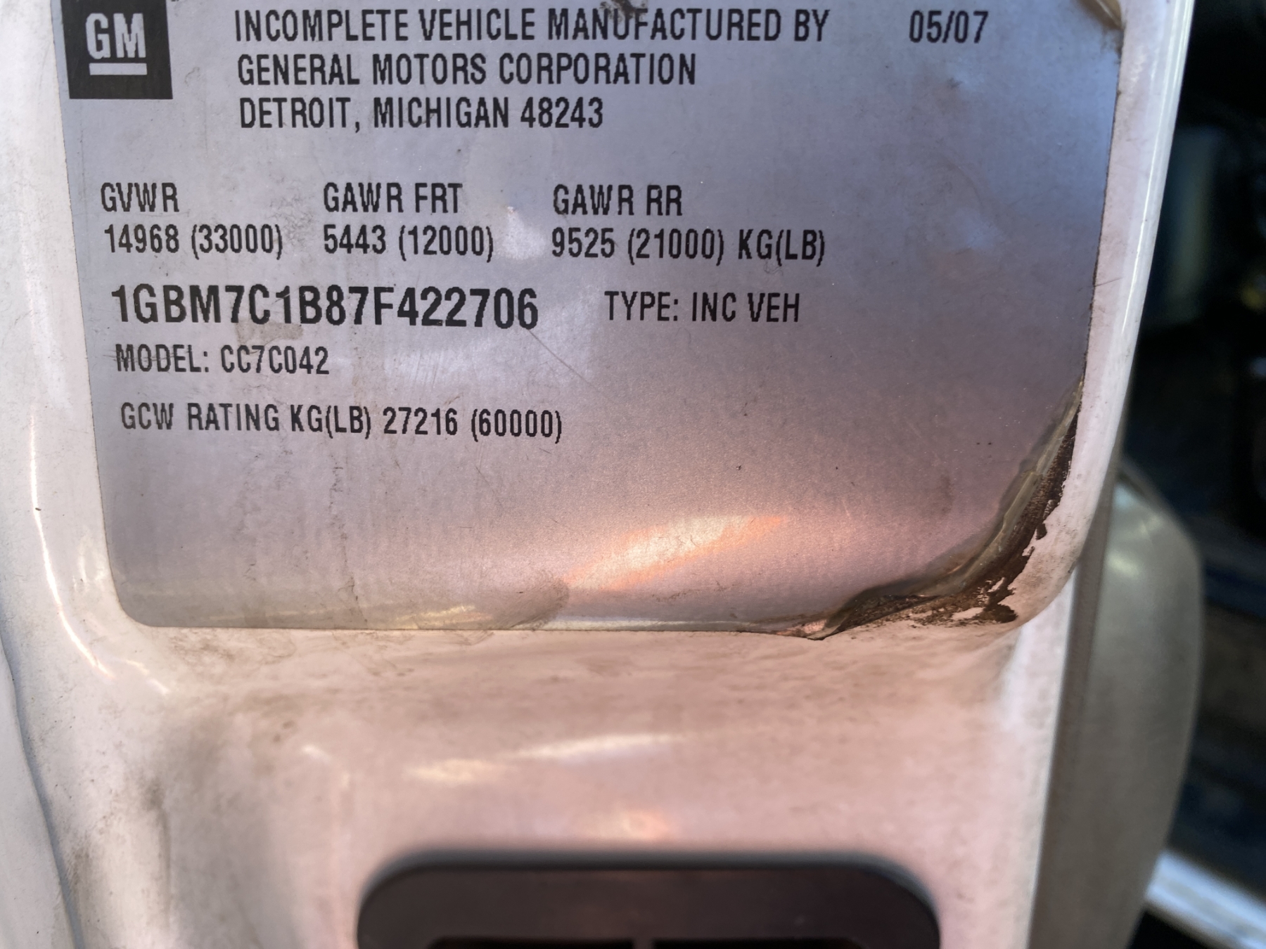 Vehicle ID Number: 1GBM7C1B87F422706