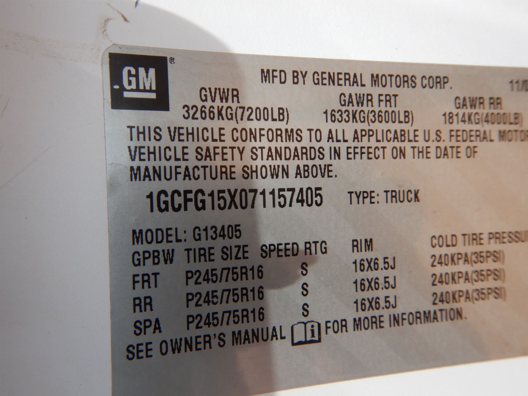 Vehicle ID Number: 1GCFG15X071157405
