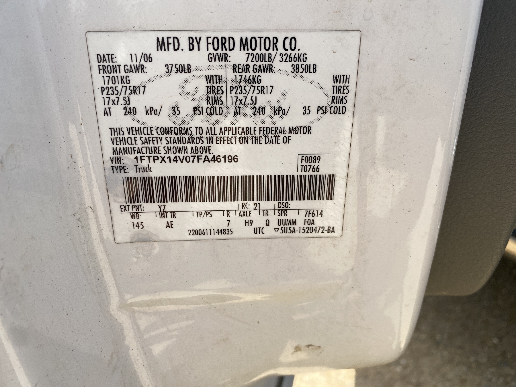 Vehicle ID Number: 1FTPX14V07FA46196