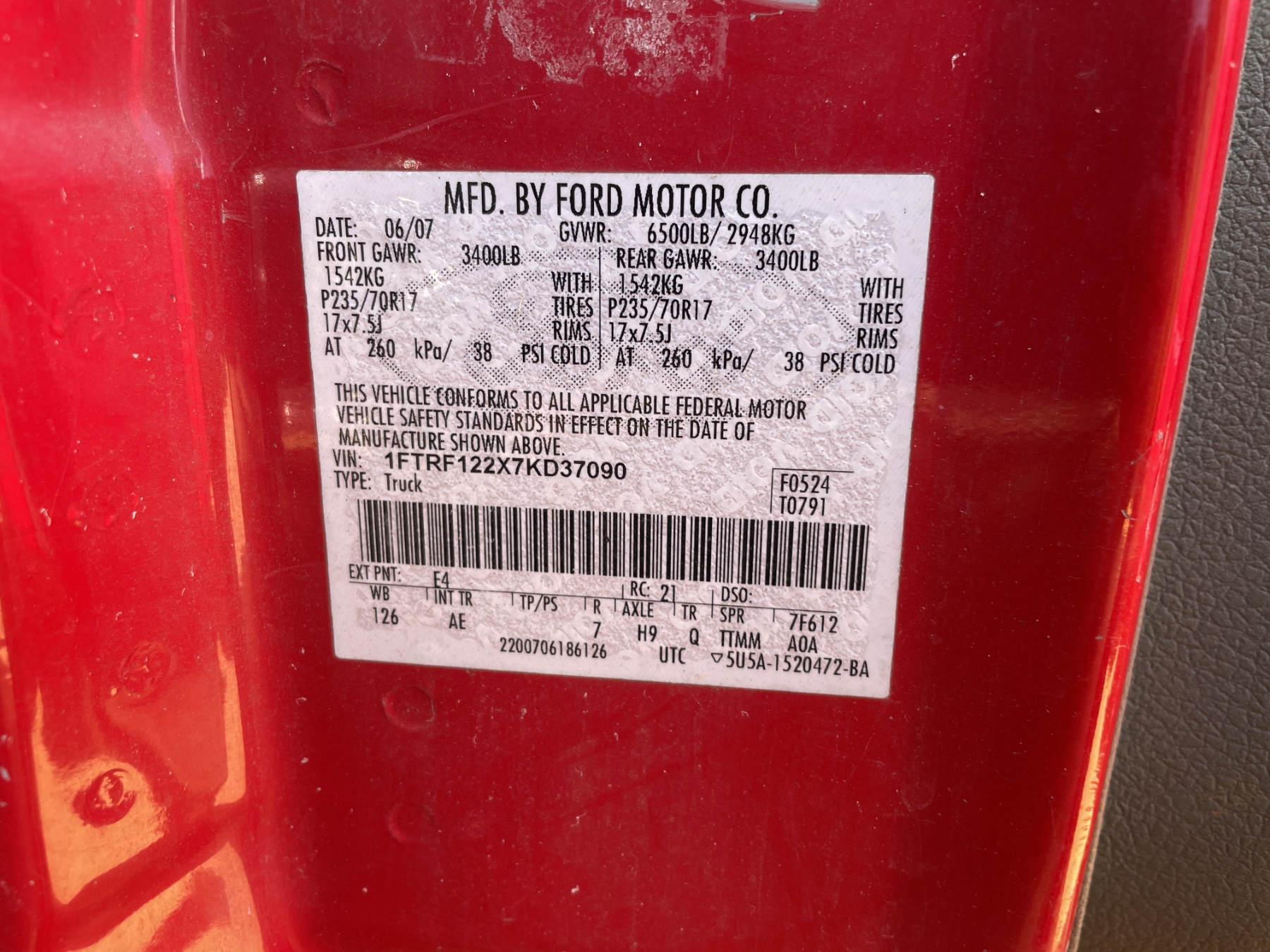 Vehicle ID Number: 1FTRF122X7KD37090