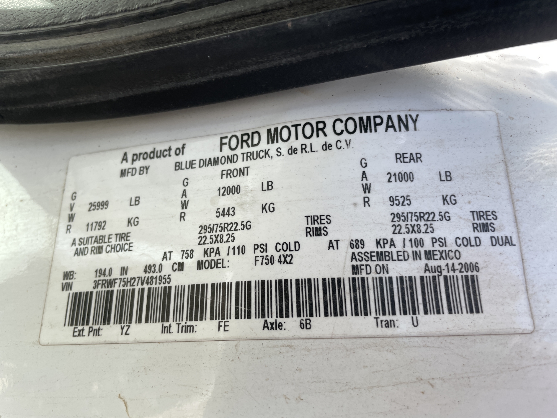 Vehicle ID Number: 3FRWF75H27V481955