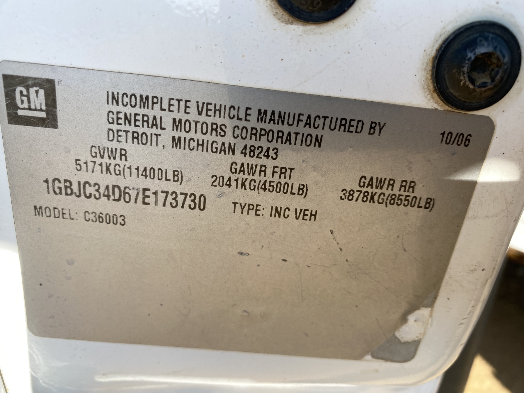 Vehicle ID Number: 1GBJC34D67E173730