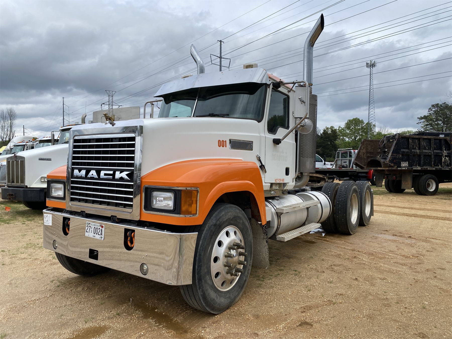 T/A, Mack engine, 18 speed trans, 44K rears, air ride, 12K front, 212" W/B, alum headache rack, wet kit, 11R24.5 tires, all alum