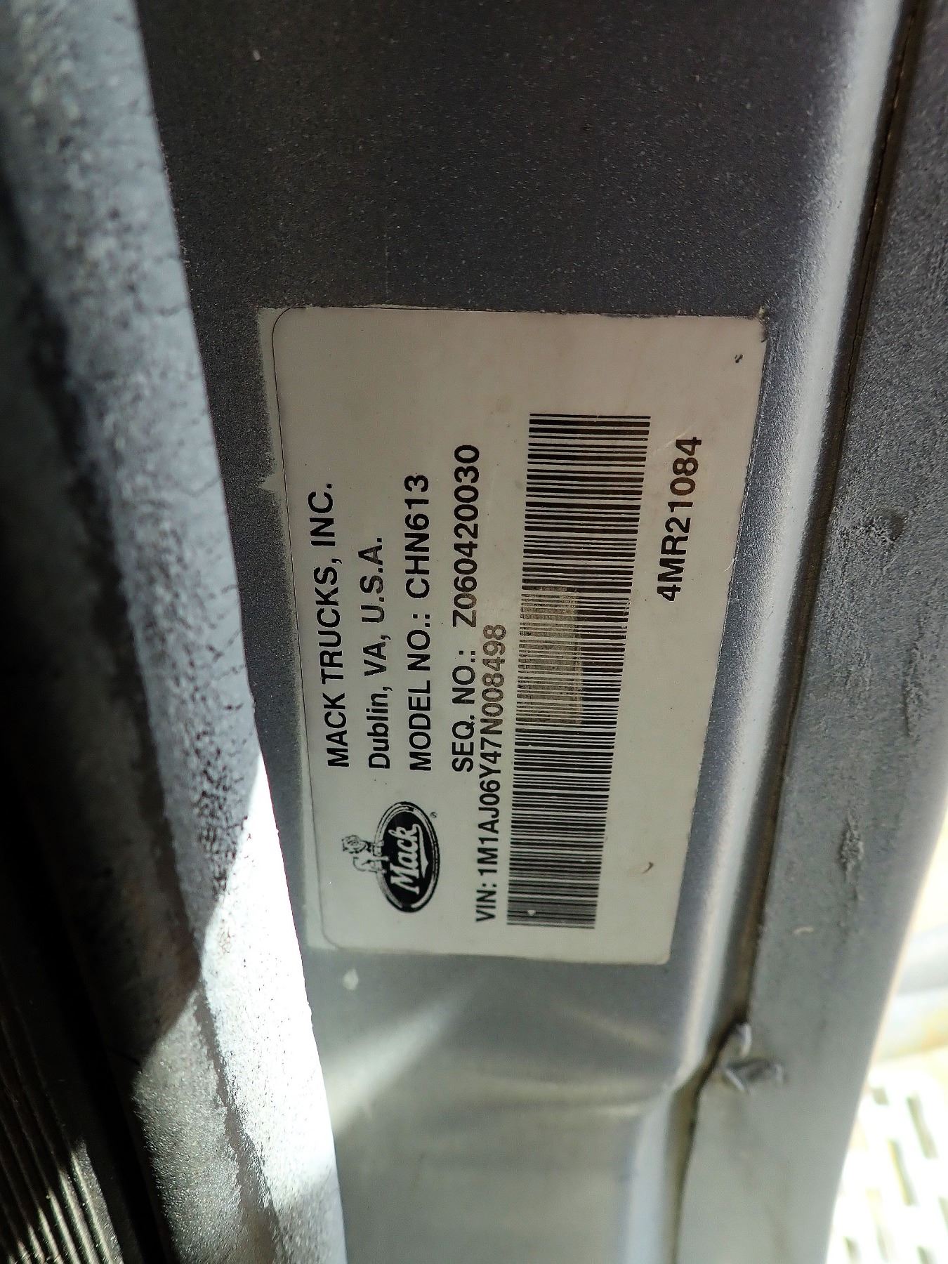 2007 MACK CHN613 TRUCK TRACTOR, VIN/SN:1M1AJ06Y47N008498 - T/A, MACK ENGINE, 10 SPEED TRANS, 44K REARS, 208" WB, 12K FRONT, 11R24.5 TIRES, ALUM FRONT