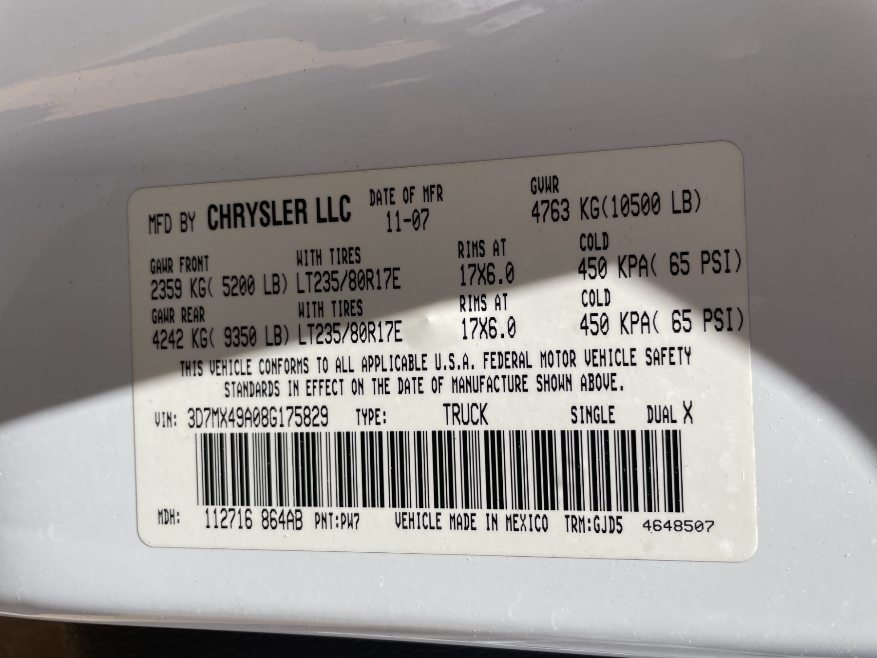 Vehicle ID Number: 3D7MX49A08G175829