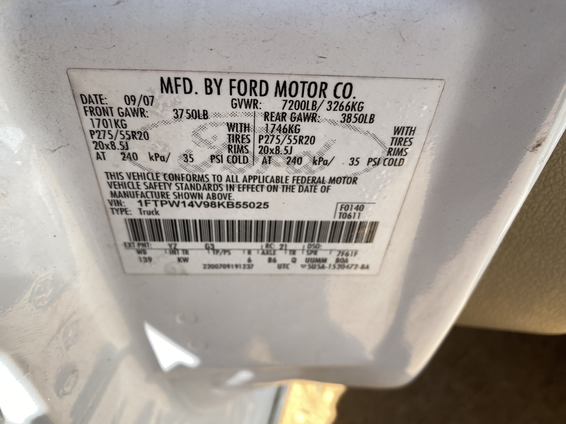 Vehicle ID Number: 1FTPW14V98KB55025