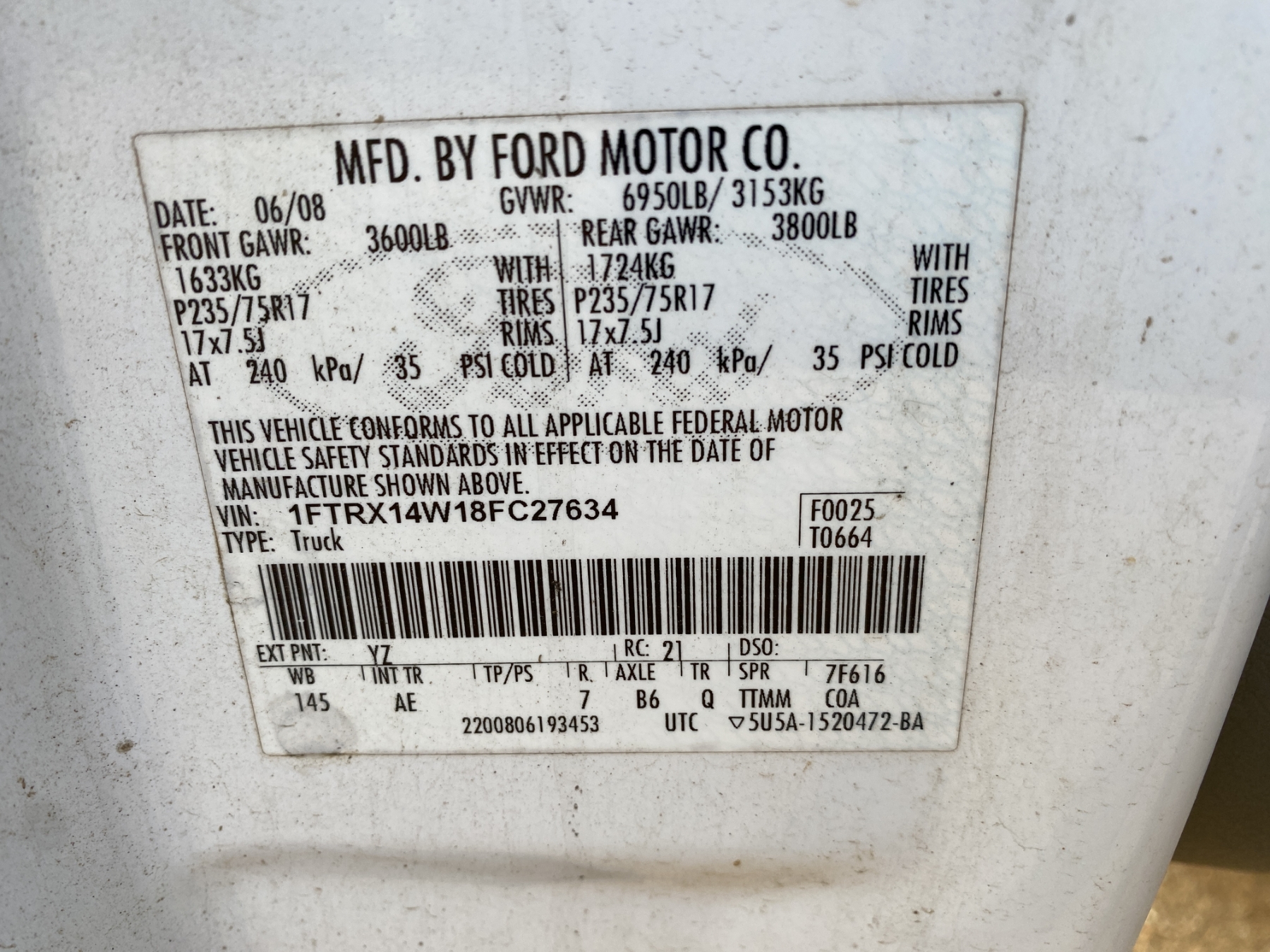Vehicle ID Number: 1FTRX14W18FC27634