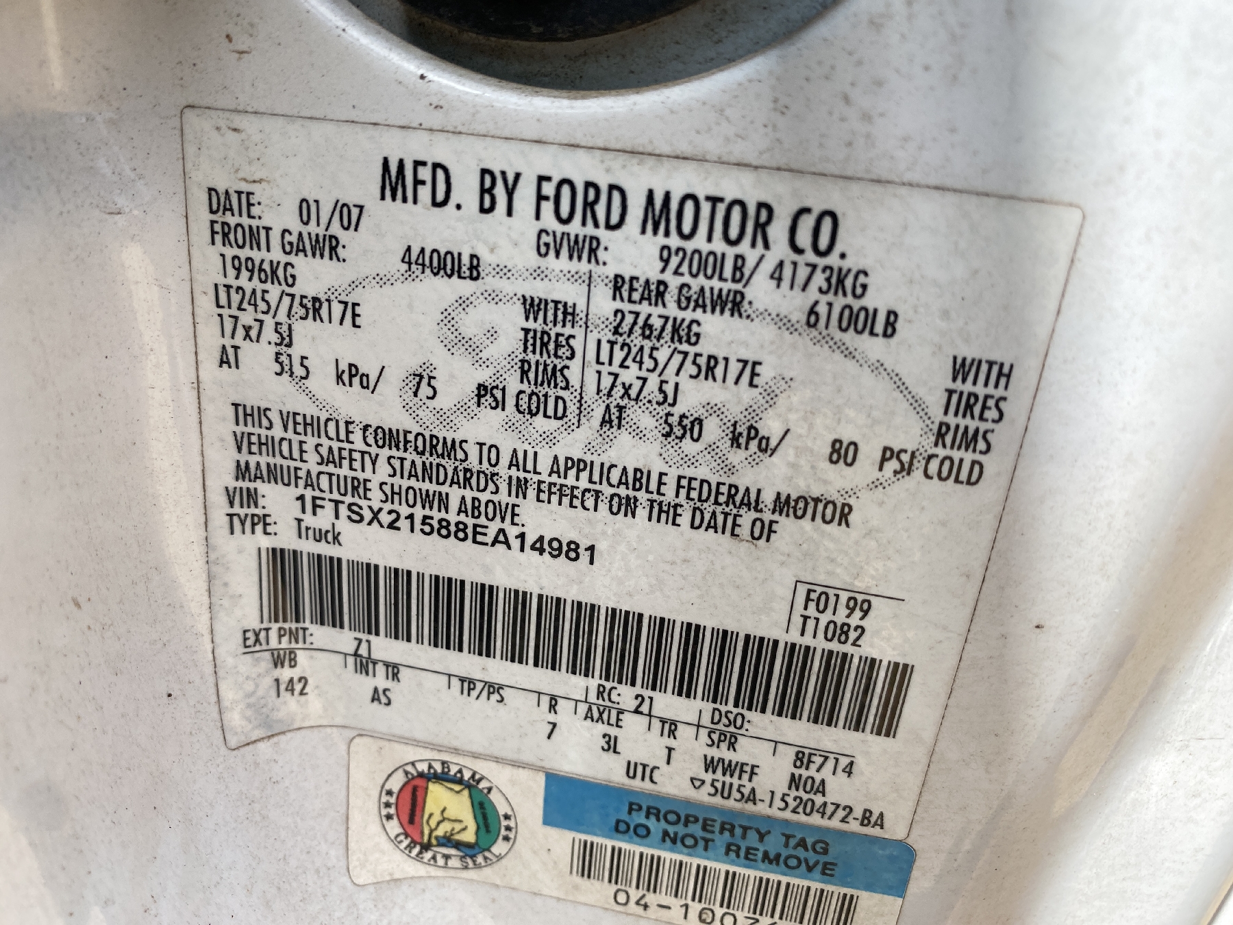 Vehicle ID Number: 1FTSX21588EA14981