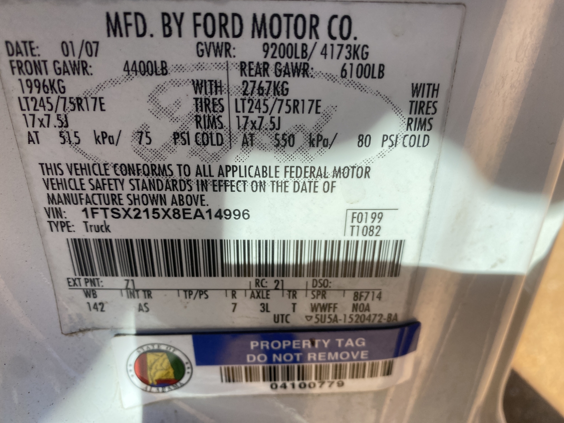 Vehicle ID Number: 1FTSX215X8EA14996