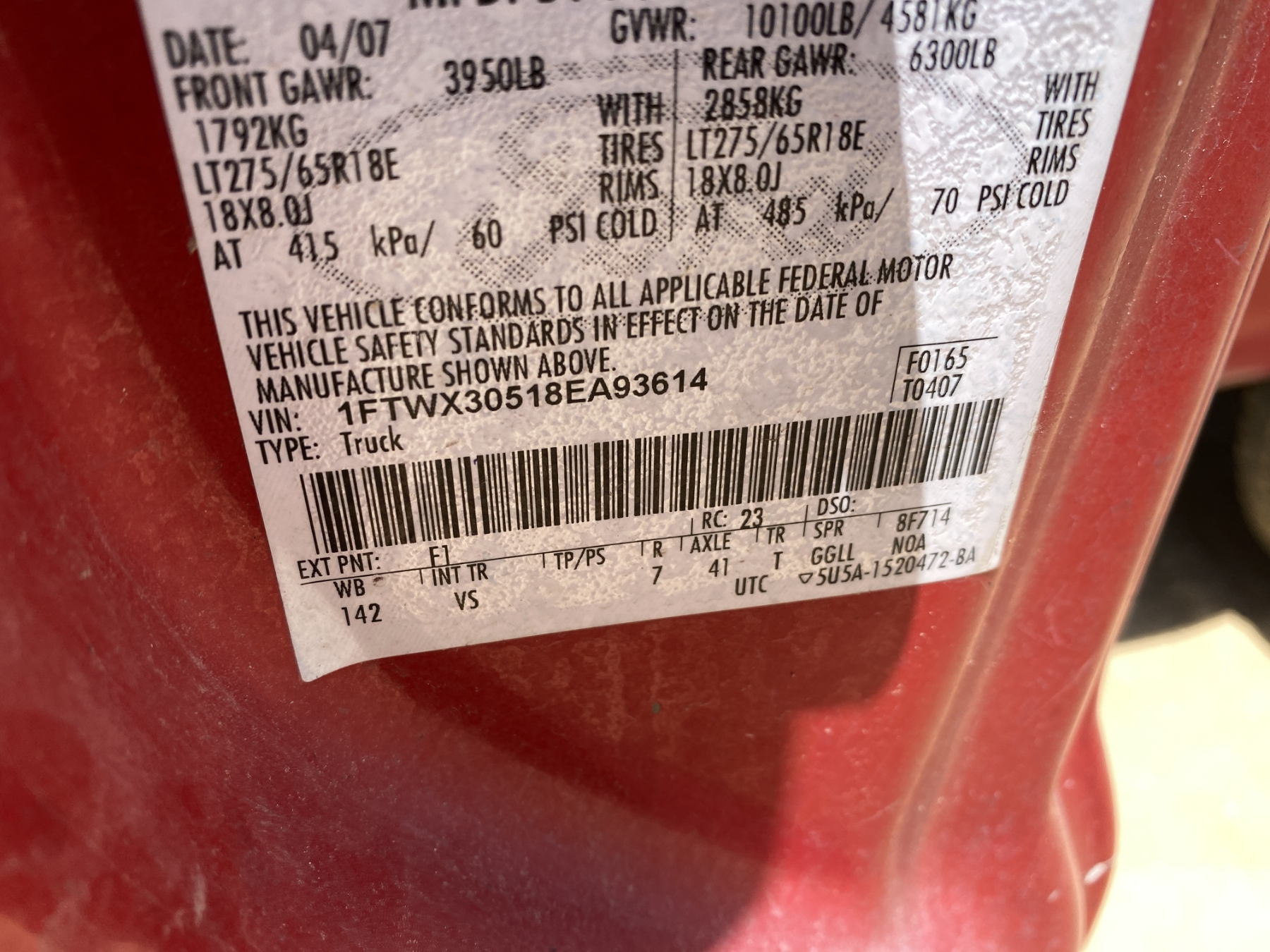 Vehicle ID Number: 1FTWX30518EA93614