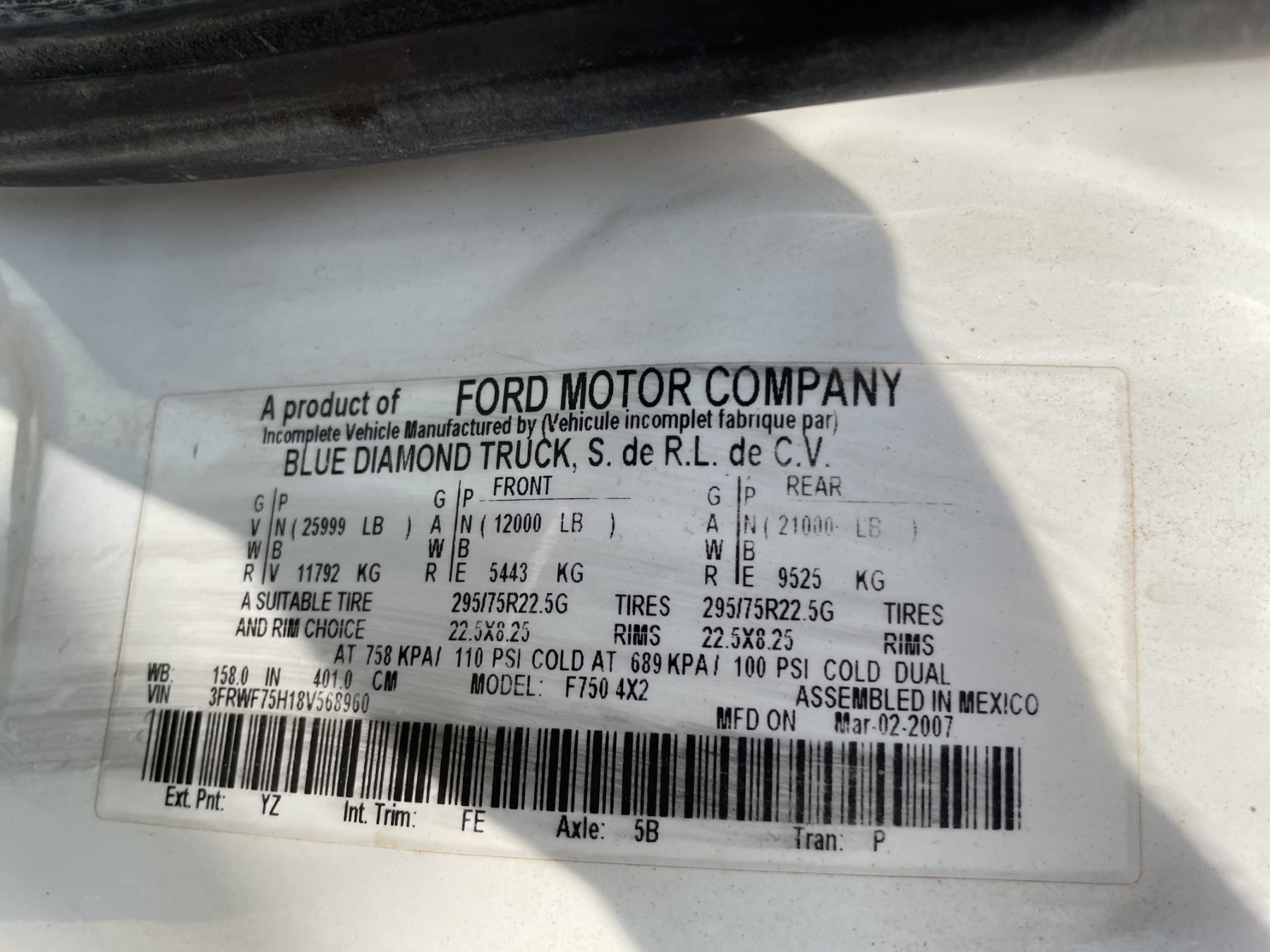 Vehicle ID Number: 3FRWF75H18V568960