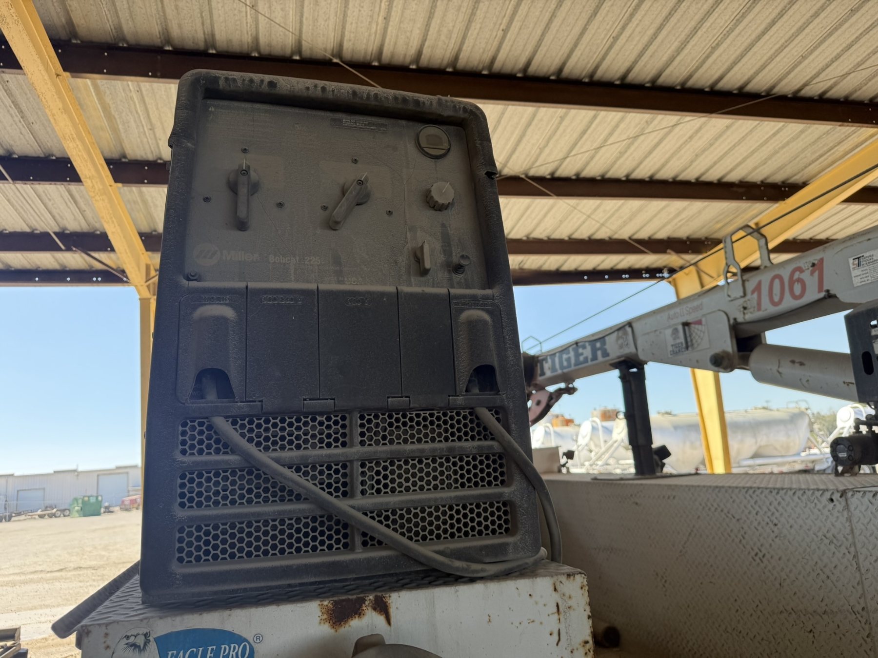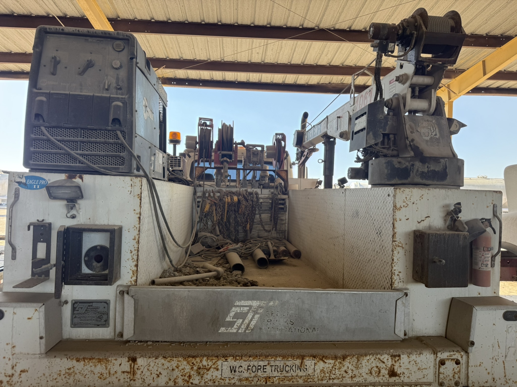 S/A, Cummins ISC engine, Allison A/T, Eagle Pro II service body, Tiger 1061 crane, (2) product tanks, hyd air compressor, Miller Bobcat 225 welder, hose reels, hyd outriggers, workbench bumper