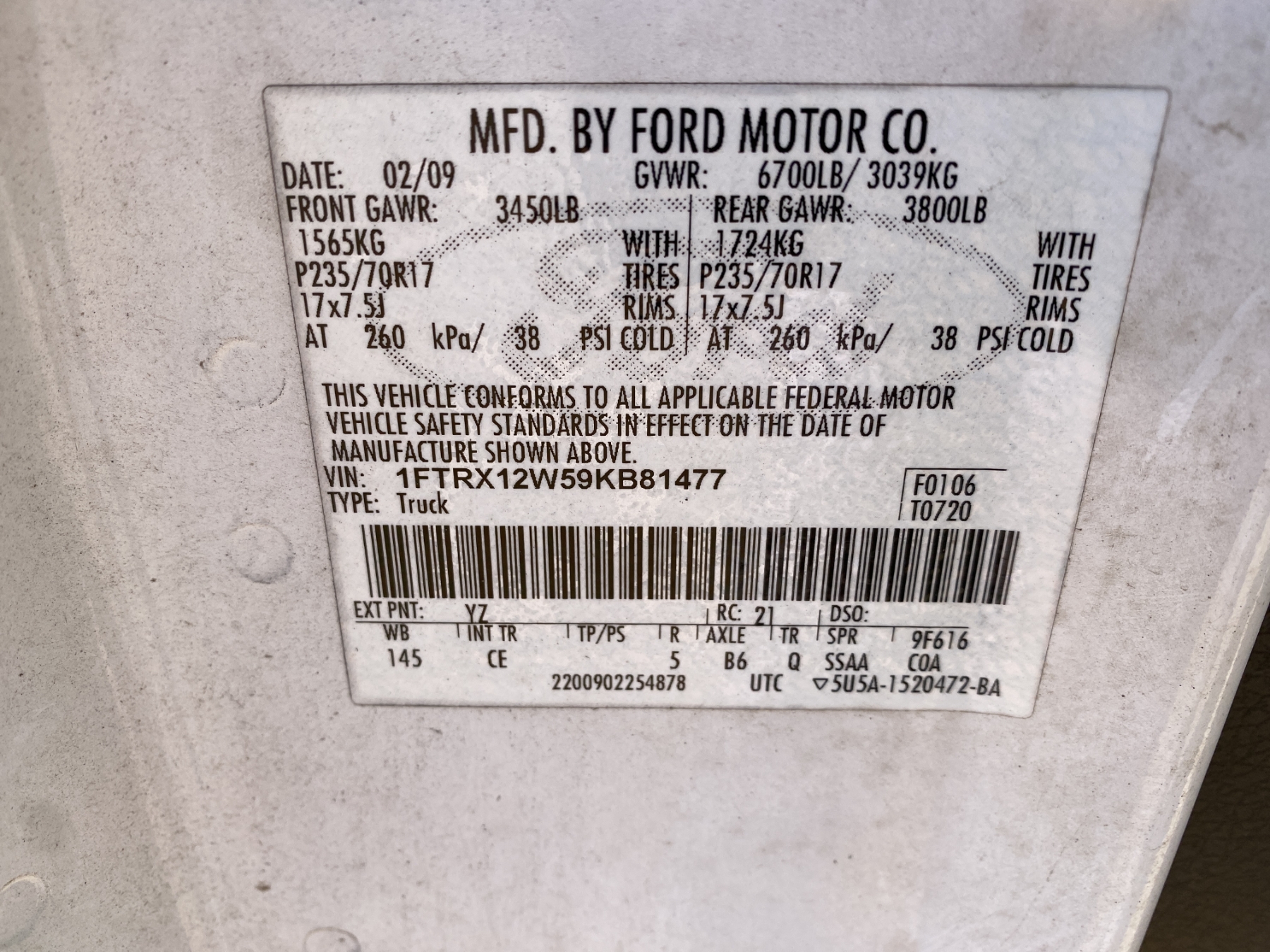 Vehicle ID Number: 1FTRX12W59KB81477