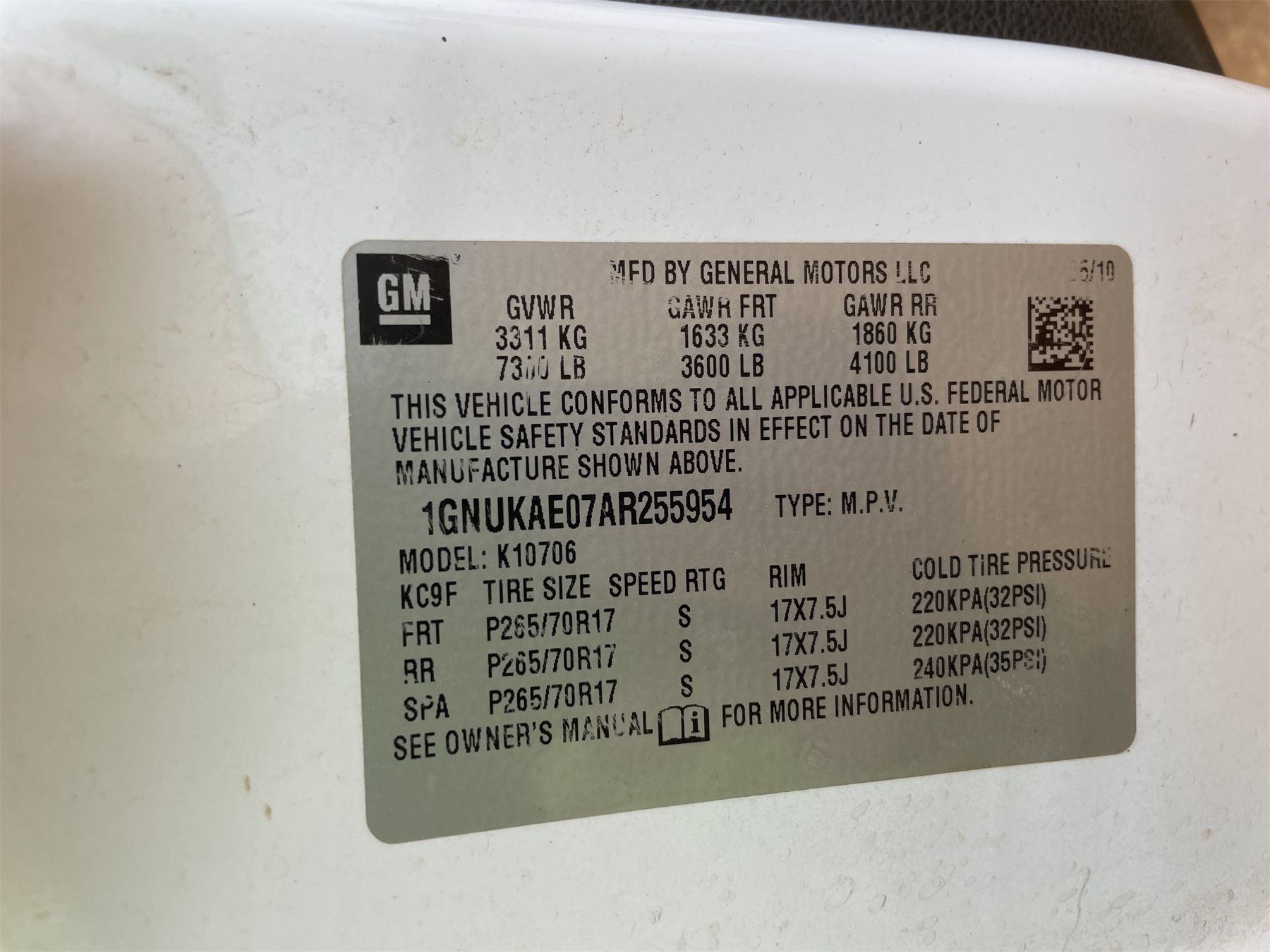 Vehicle ID Number: 1GNUKAE07AR255954