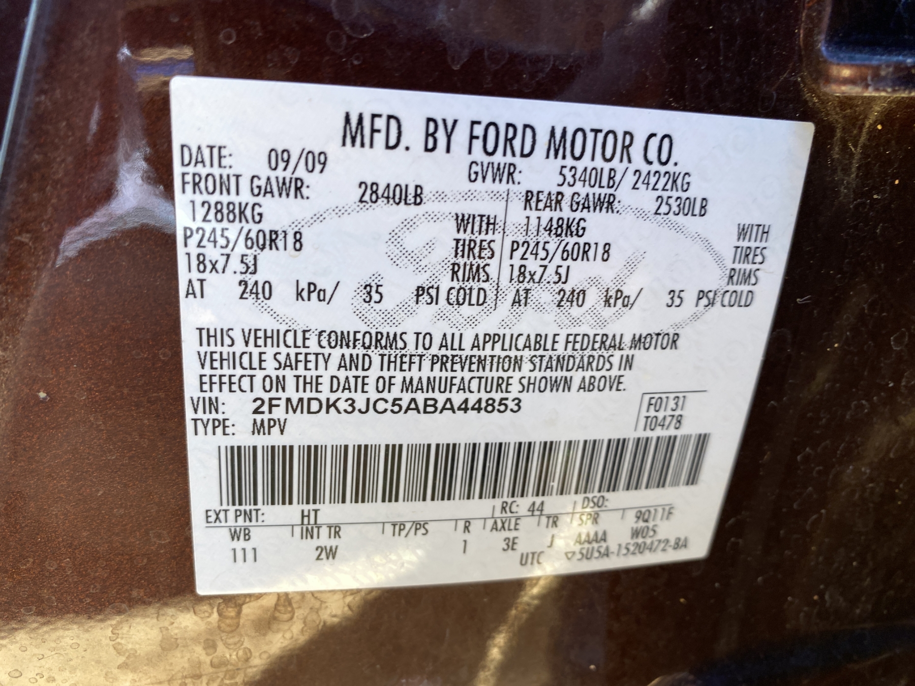 Vehicle ID Number: 2FMDK3JC5ABA44853