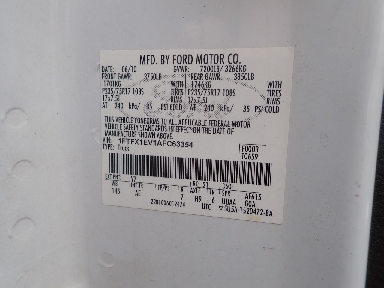 Vehicle ID Number: 1FTFX1EV1AFC63354