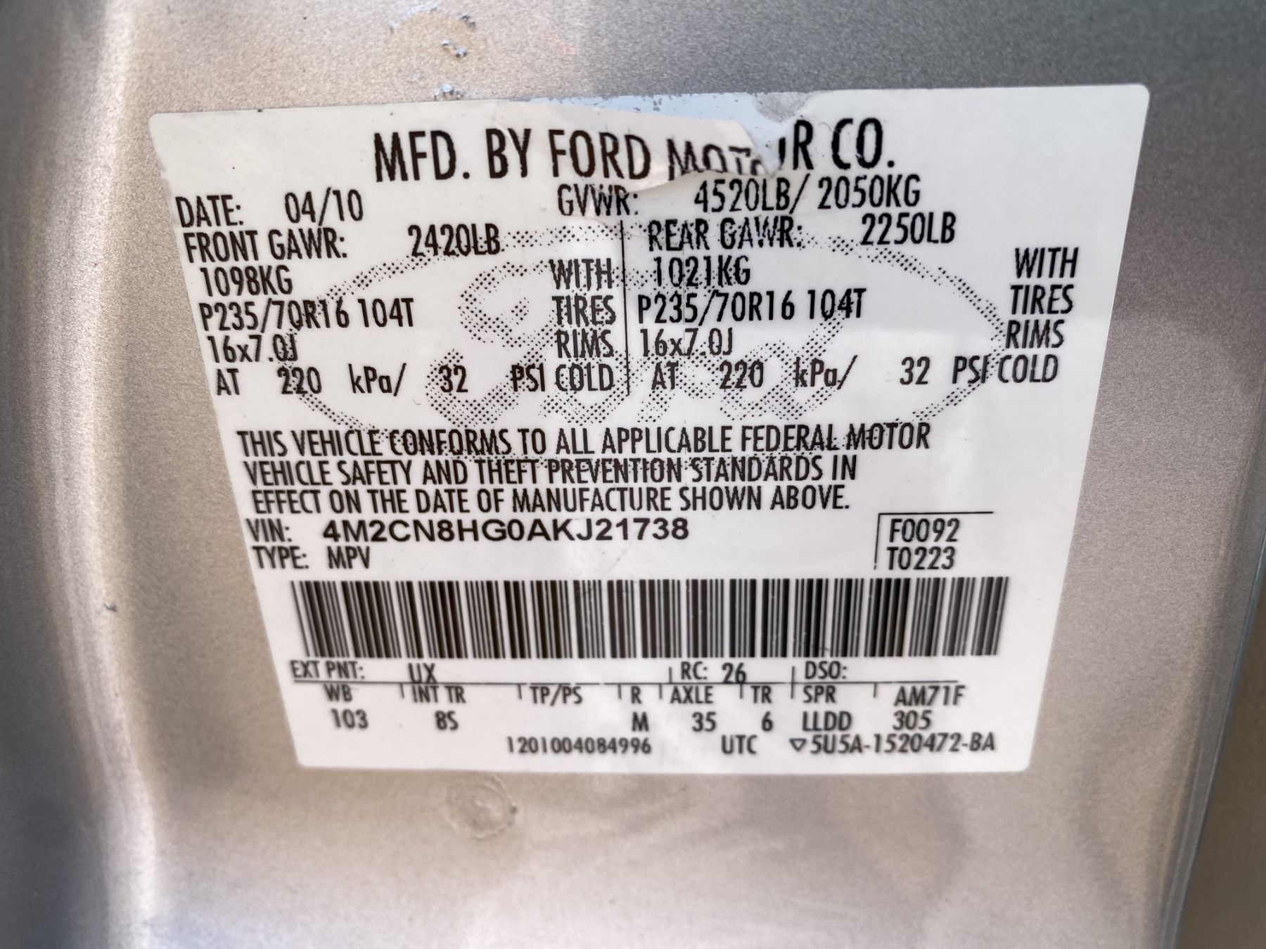 Vehicle ID Number: 4M2CN8HG0AKJ21738