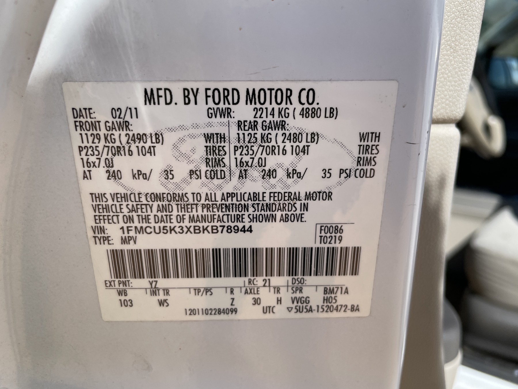 Vehicle ID Number: 1FMCU5K3XBKB78944
