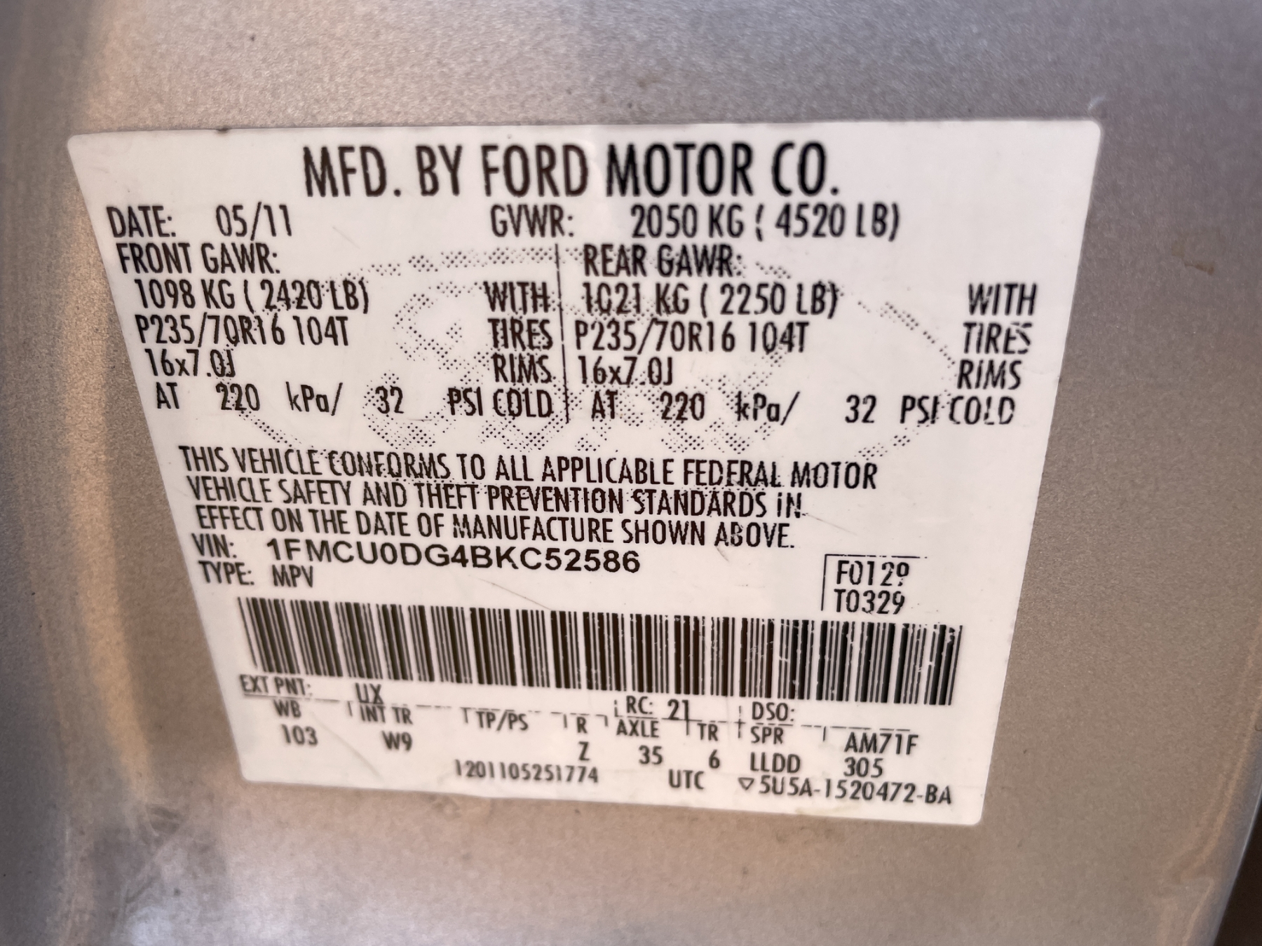 Vehicle ID Number: 1FMCU0DG4BKC52586