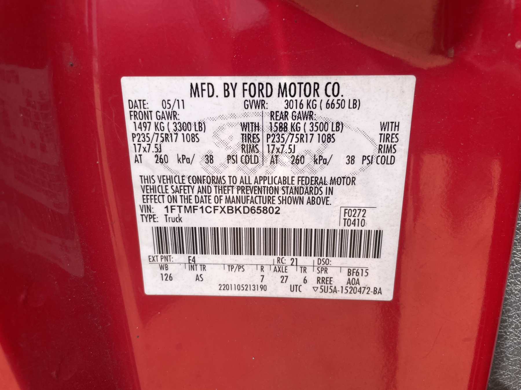 Vehicle ID Number: 1FTMF1CFXBKD65802
